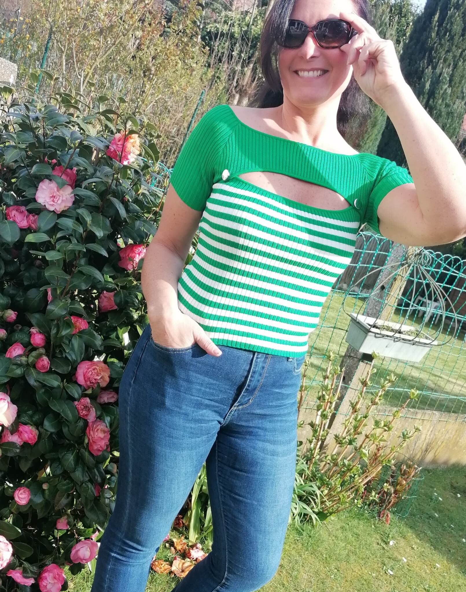 Top stretch en matière côtelée, rayé avec jolie ouverture ornée de 2 boutons métallisés.