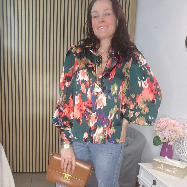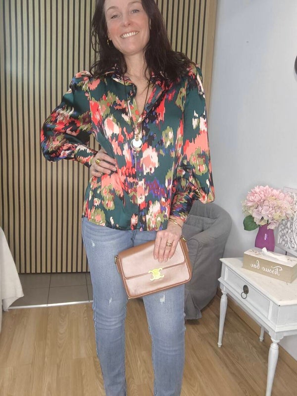 Chemisier effet satin, pinces aux épaules et manches bouffantes.