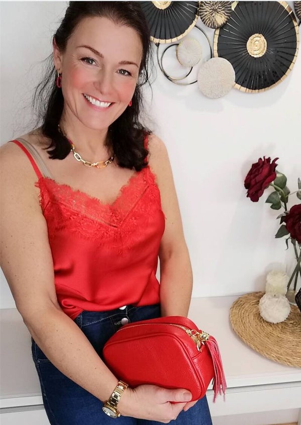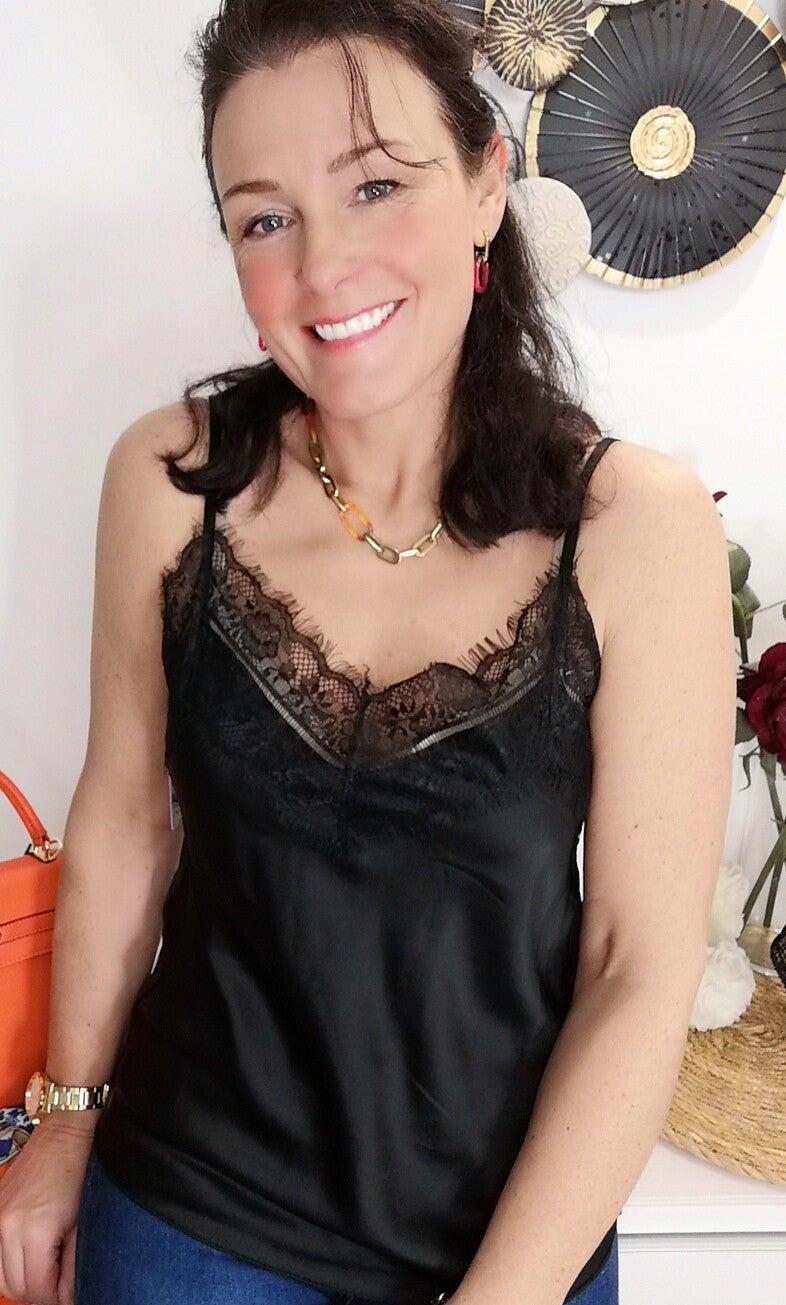 Top satiné avec décolleté en dentelle, lisse à l'arrière. Bretelles réglables.