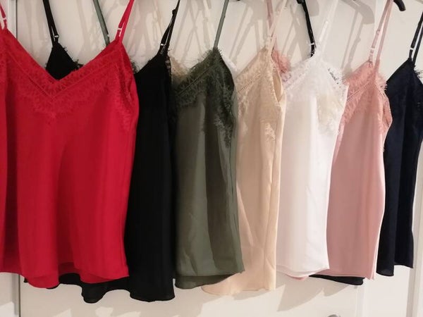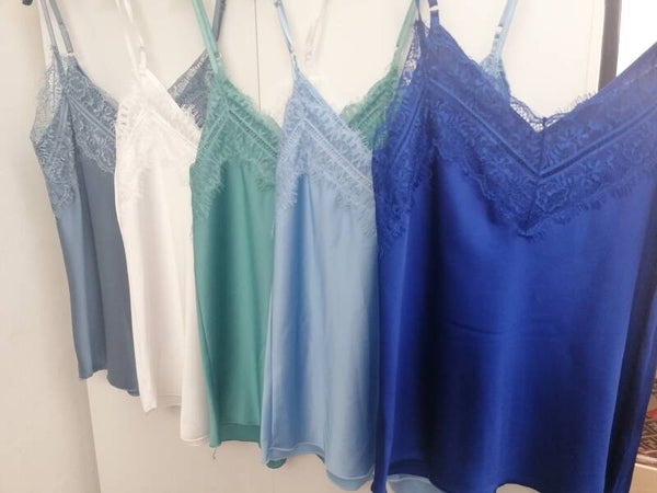 Top satiné avec décolleté en dentelle, lisse à l'arrière. Bretelles réglables.