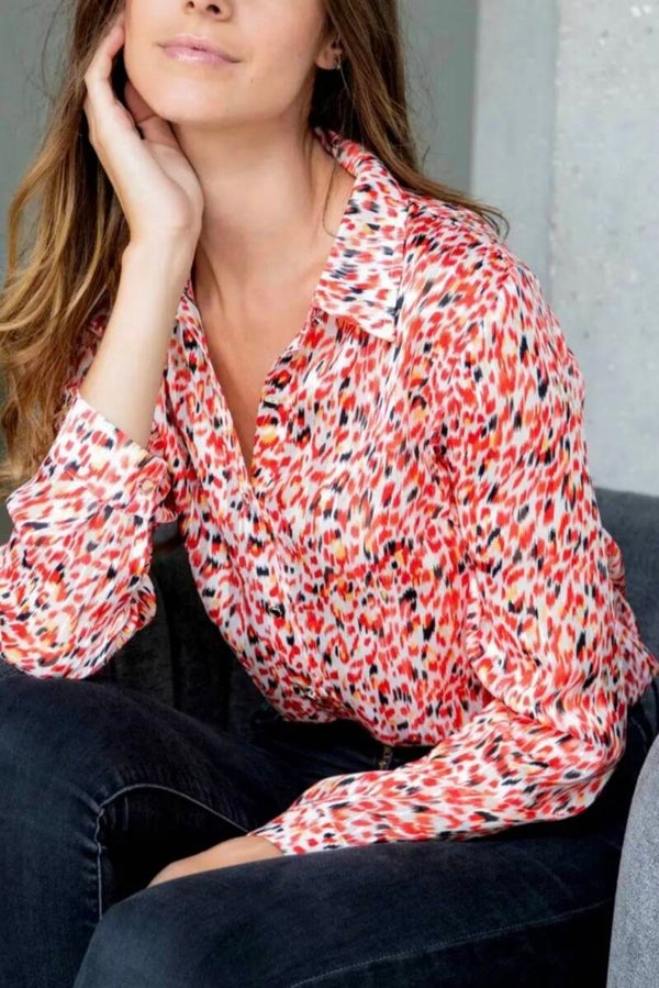 Chemisier fluide imprimé avec fil lurex et boutons dorés.
