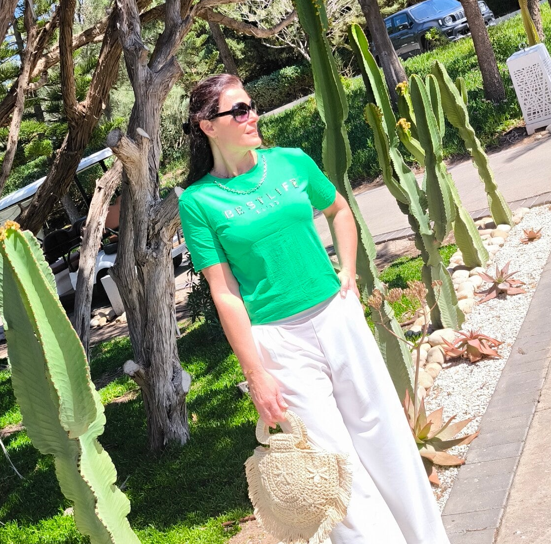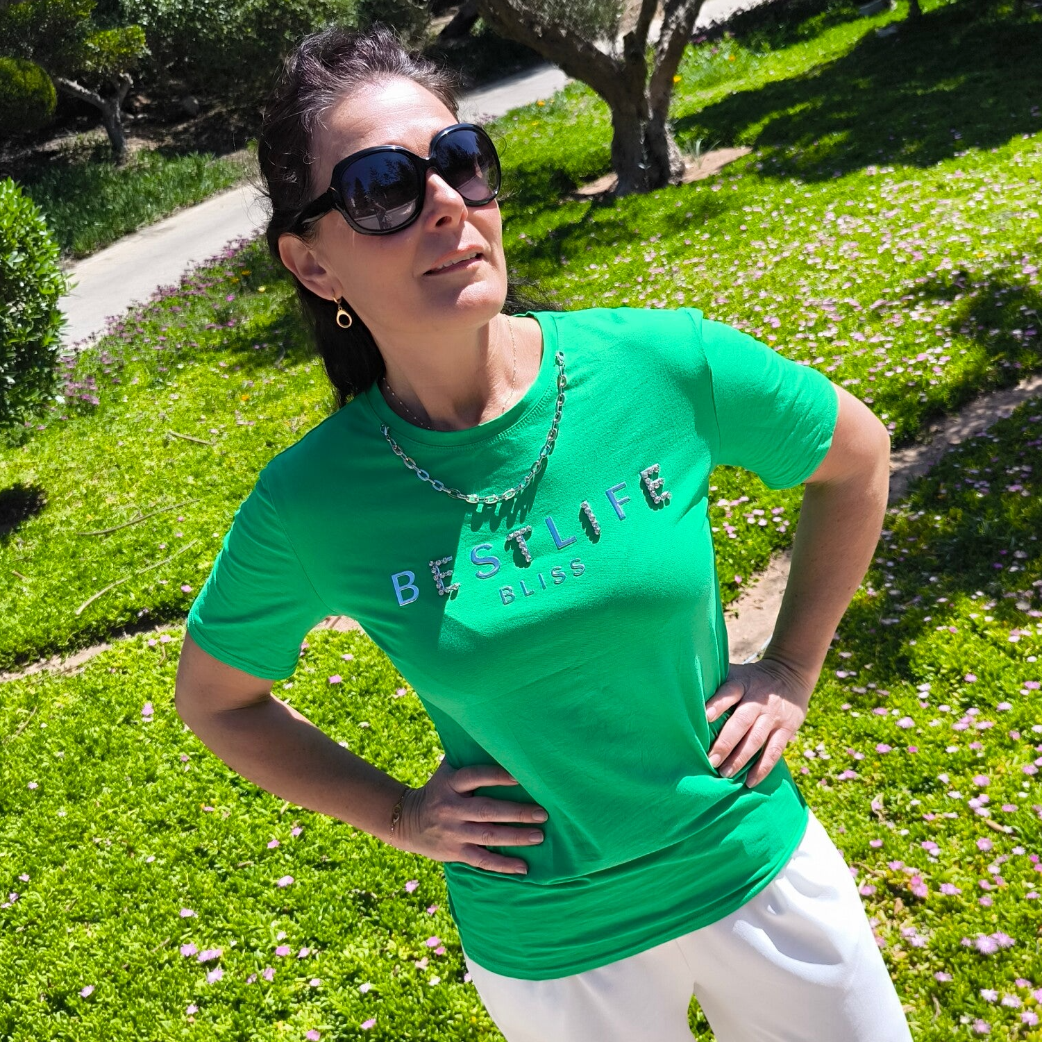 T-shirt col rond, manches courtes, strass stretch, chaîne décorative au cou amovible, logo imprimé "Best Life" argenté avec strass.