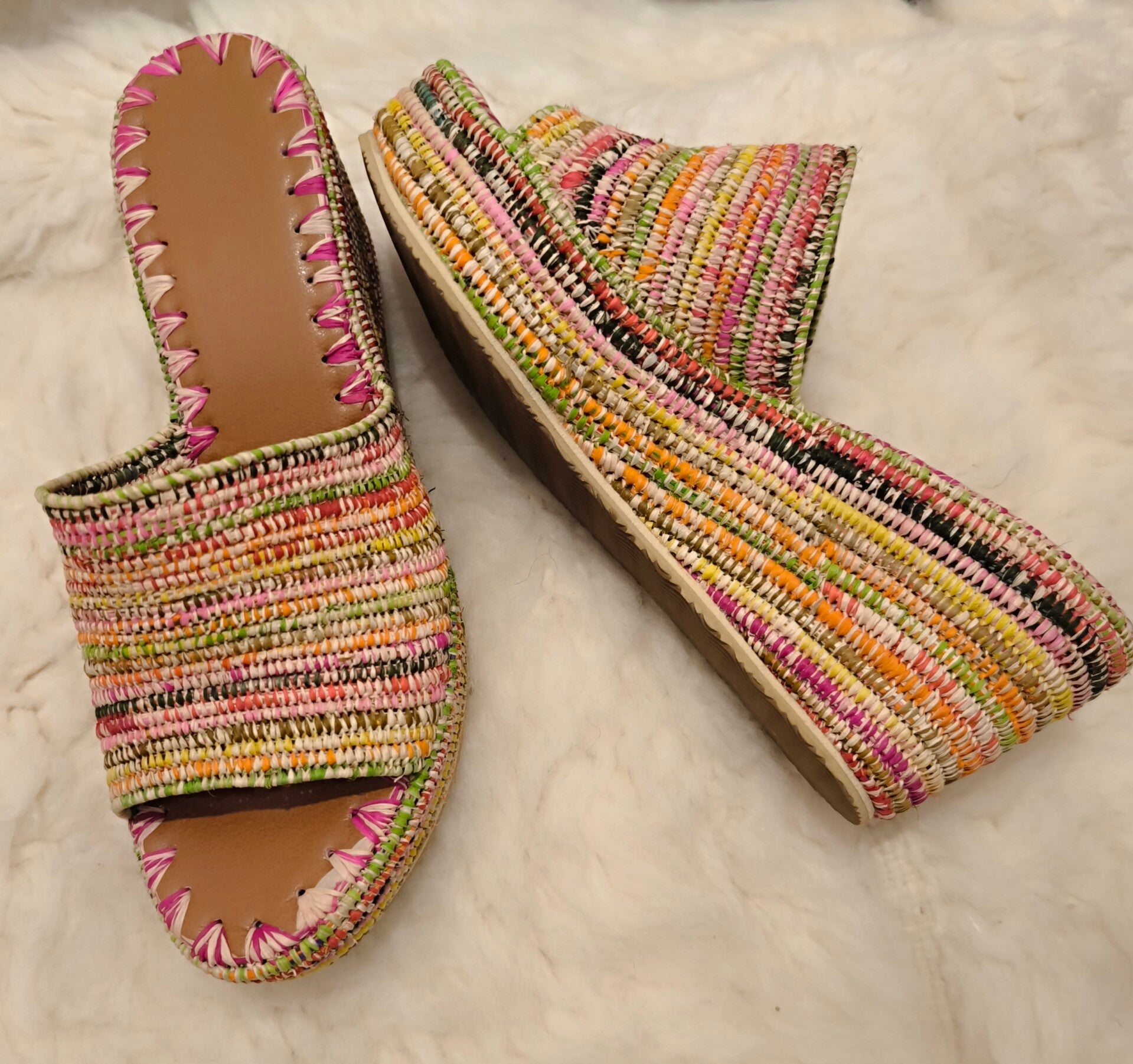 Sandales compensées en cordes de couleurs, semelle intérieure cuir et semelles antidérapantes, entièrement fait à la main made in Essaouira.