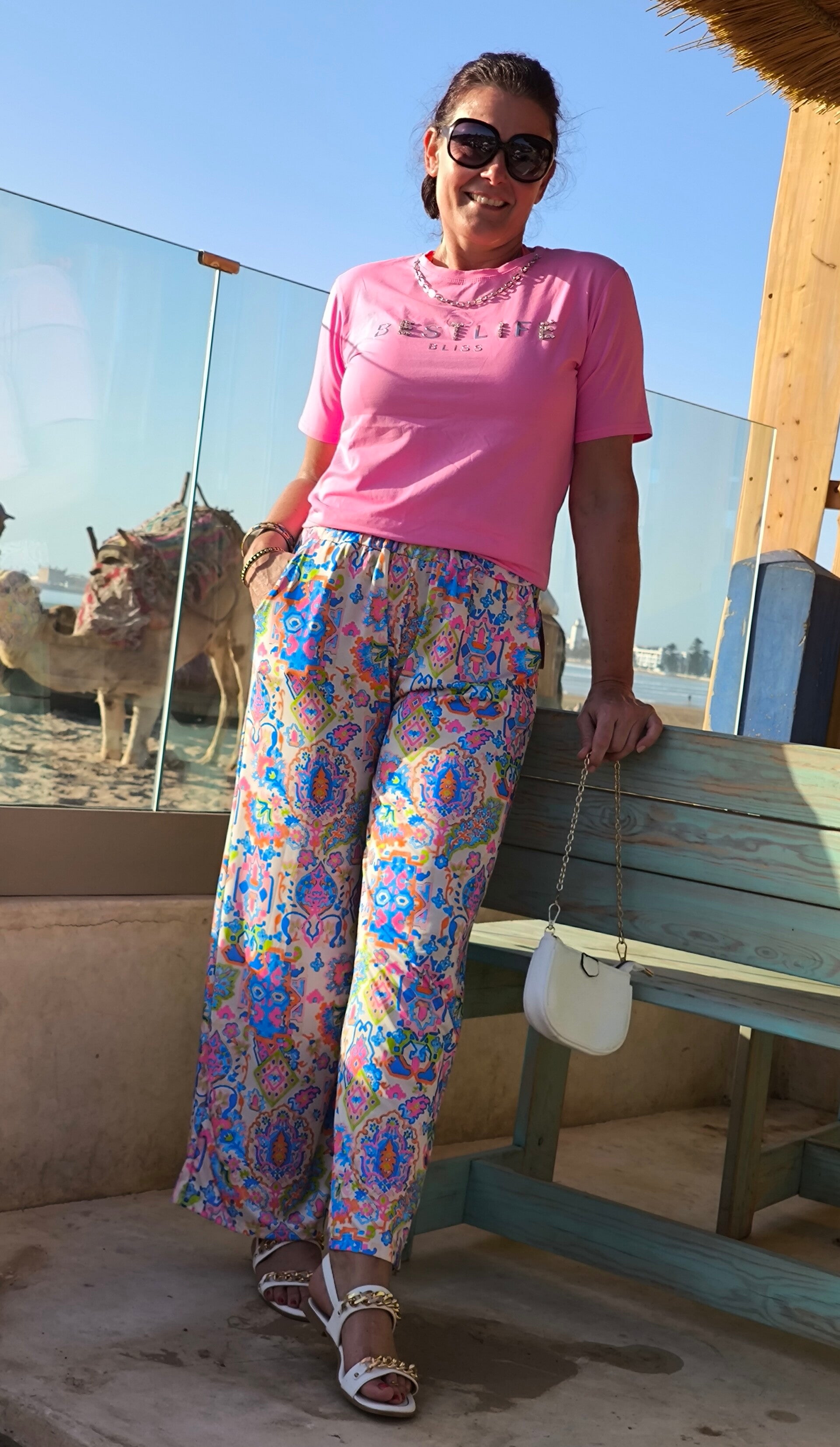 T-shirt col rond, manches courtes, strass stretch, chaîne décorative au cou amovible, logo imprimé "Best Life" argenté avec strass.