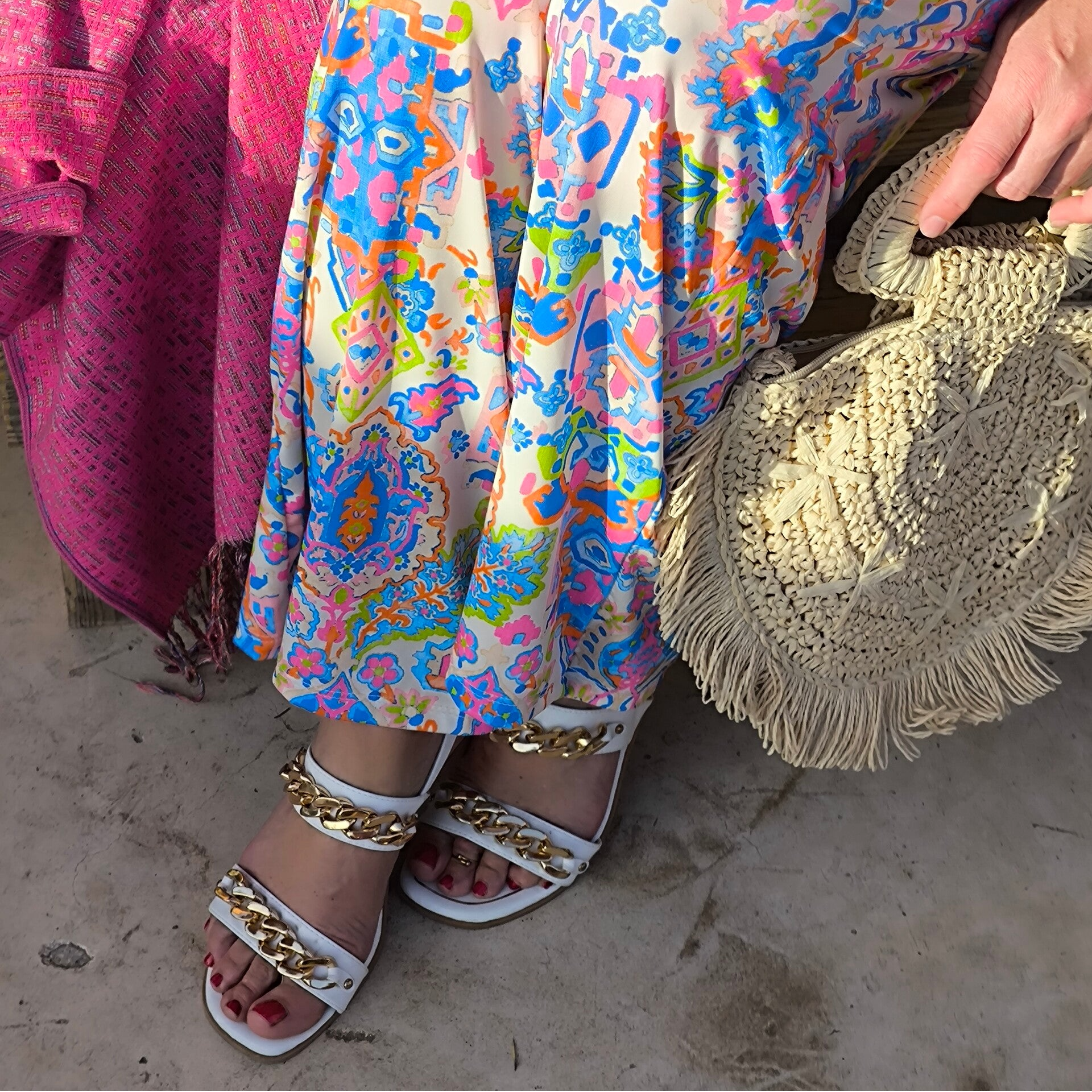 Sandales blanche avec chaine dorée sur le dessus et sangle au niveau de la cheville.