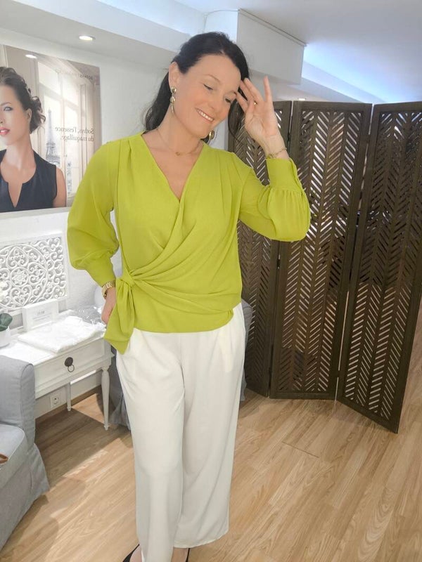 Blouse fluide doublée au corps ,col V, avec drapage côté, transparence des bras, bouton manche.