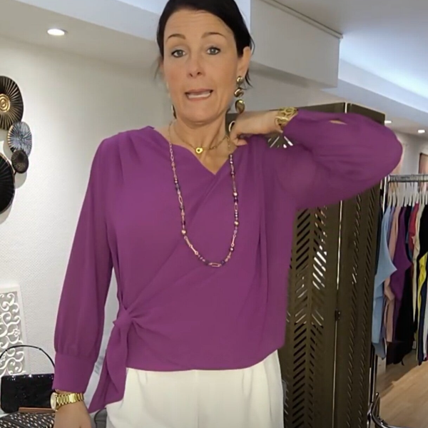 Blouse fluide doublée au corps ,col V, avec drapage côté, transparence des bras, bouton manche.