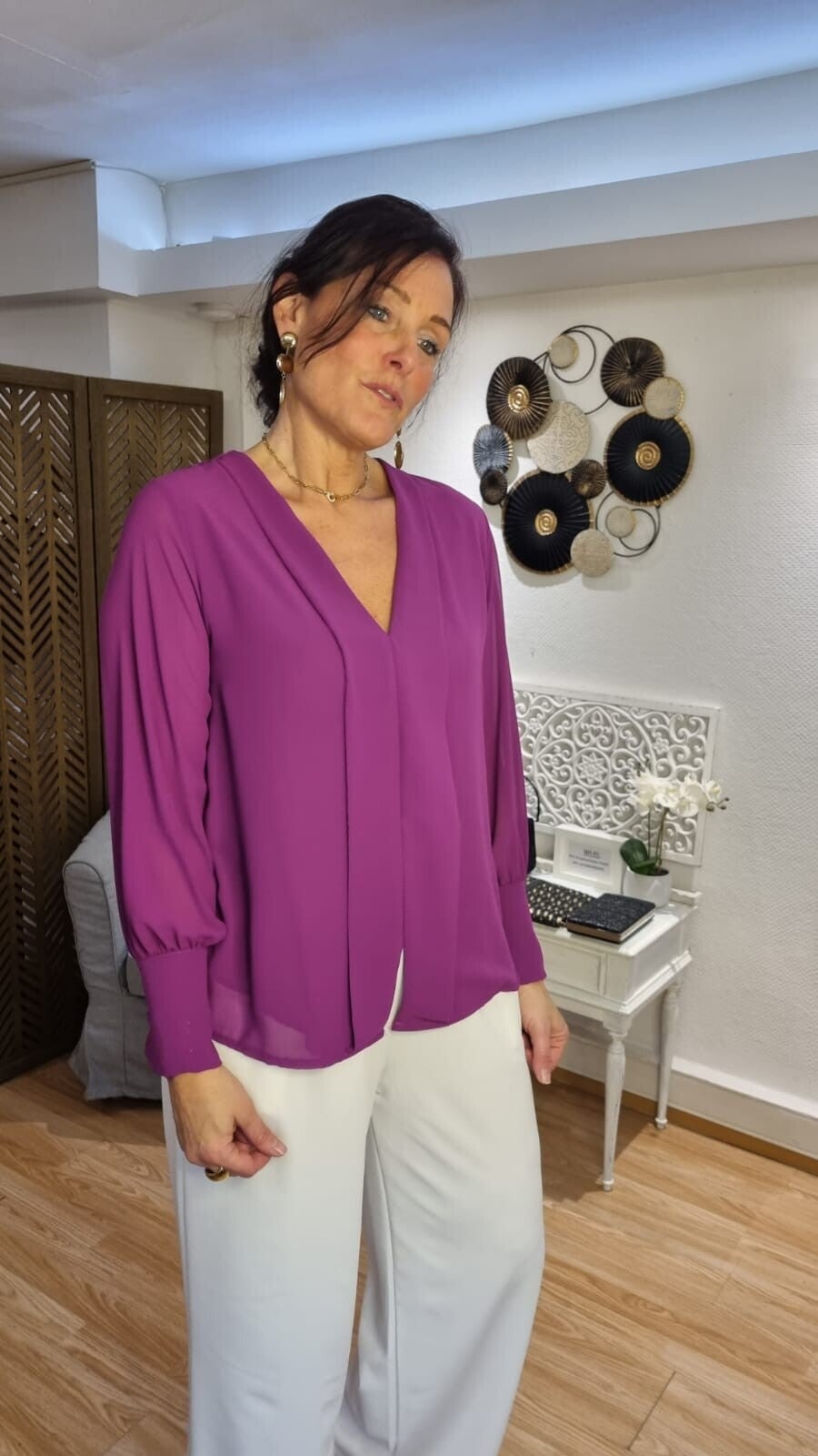 Blouse fluide doublée au corps, col V, manches transparentes. Double boutons aux manches.