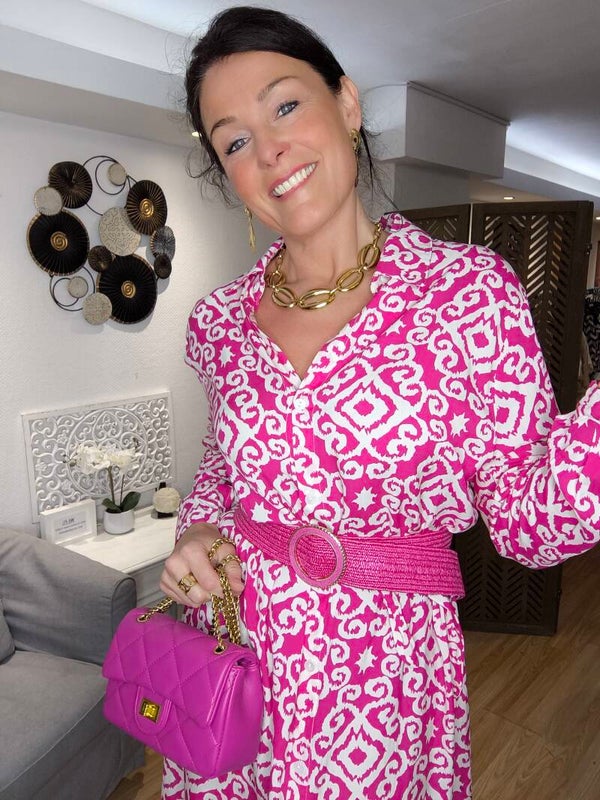 Robe chemise imprimée entièrement boutonnée. Patte avec bouton pour relever la manche. Cordon dans le même tissu pour nouer à la taille.