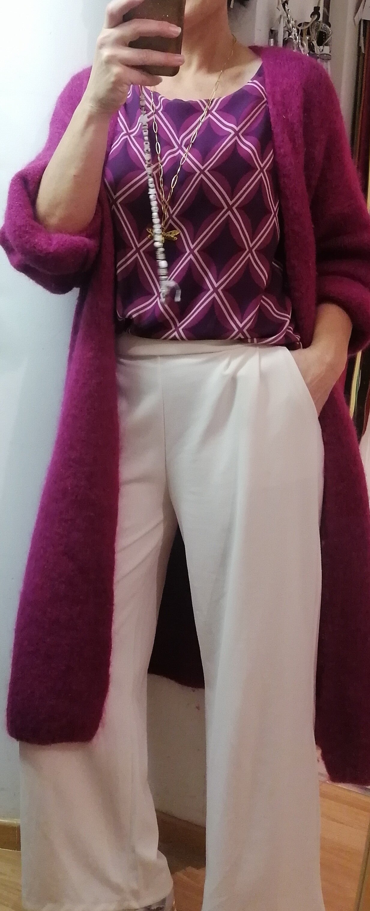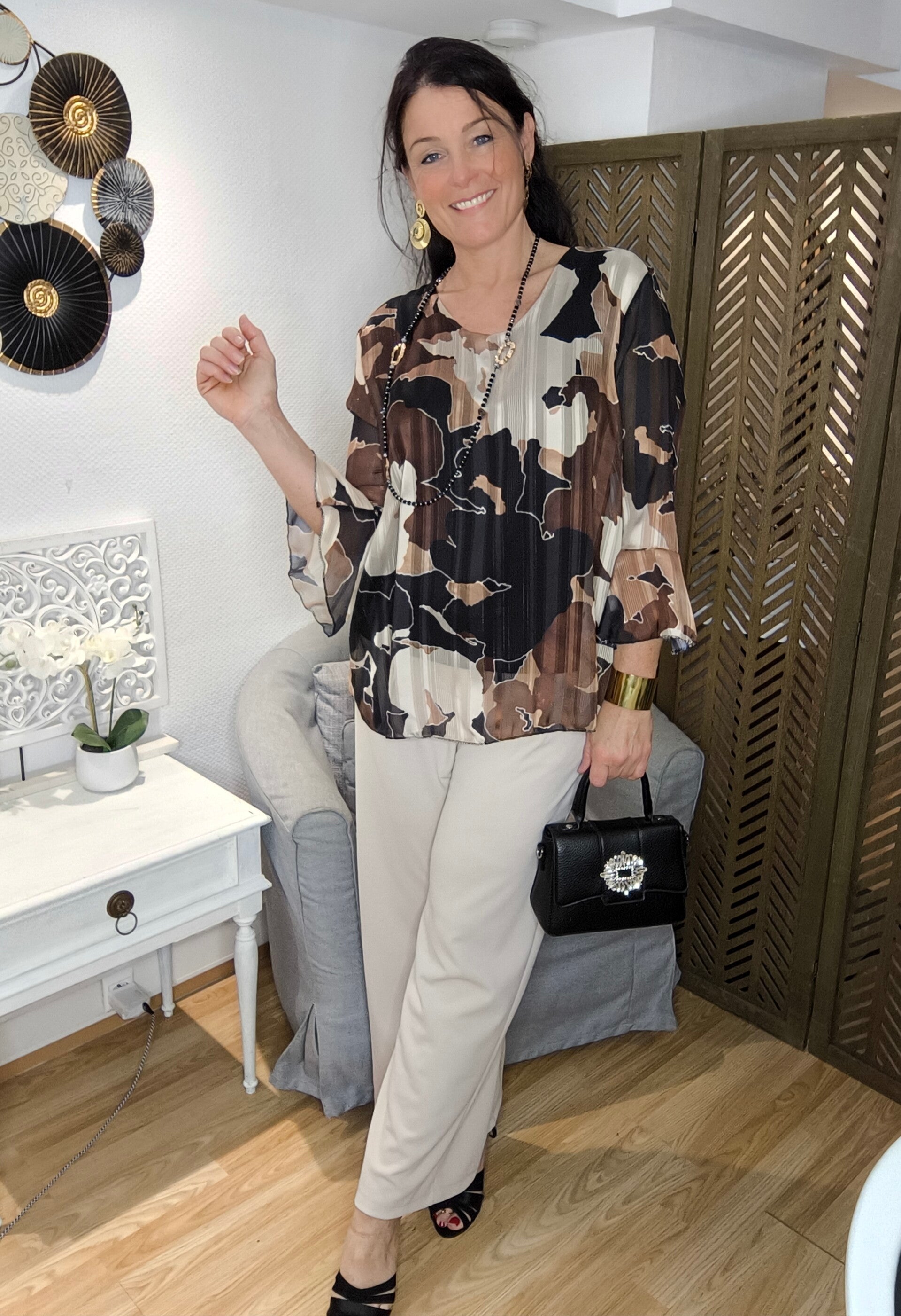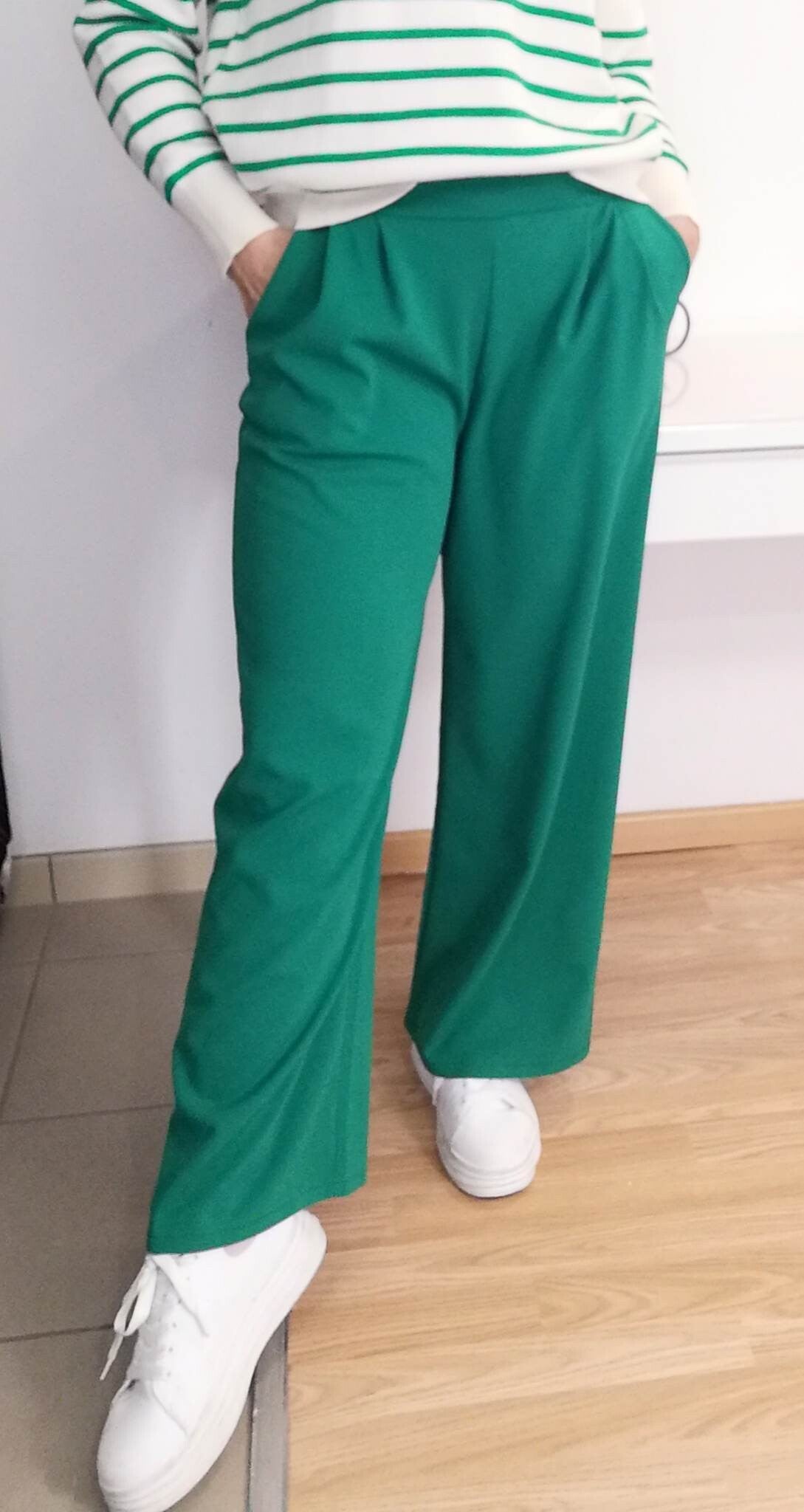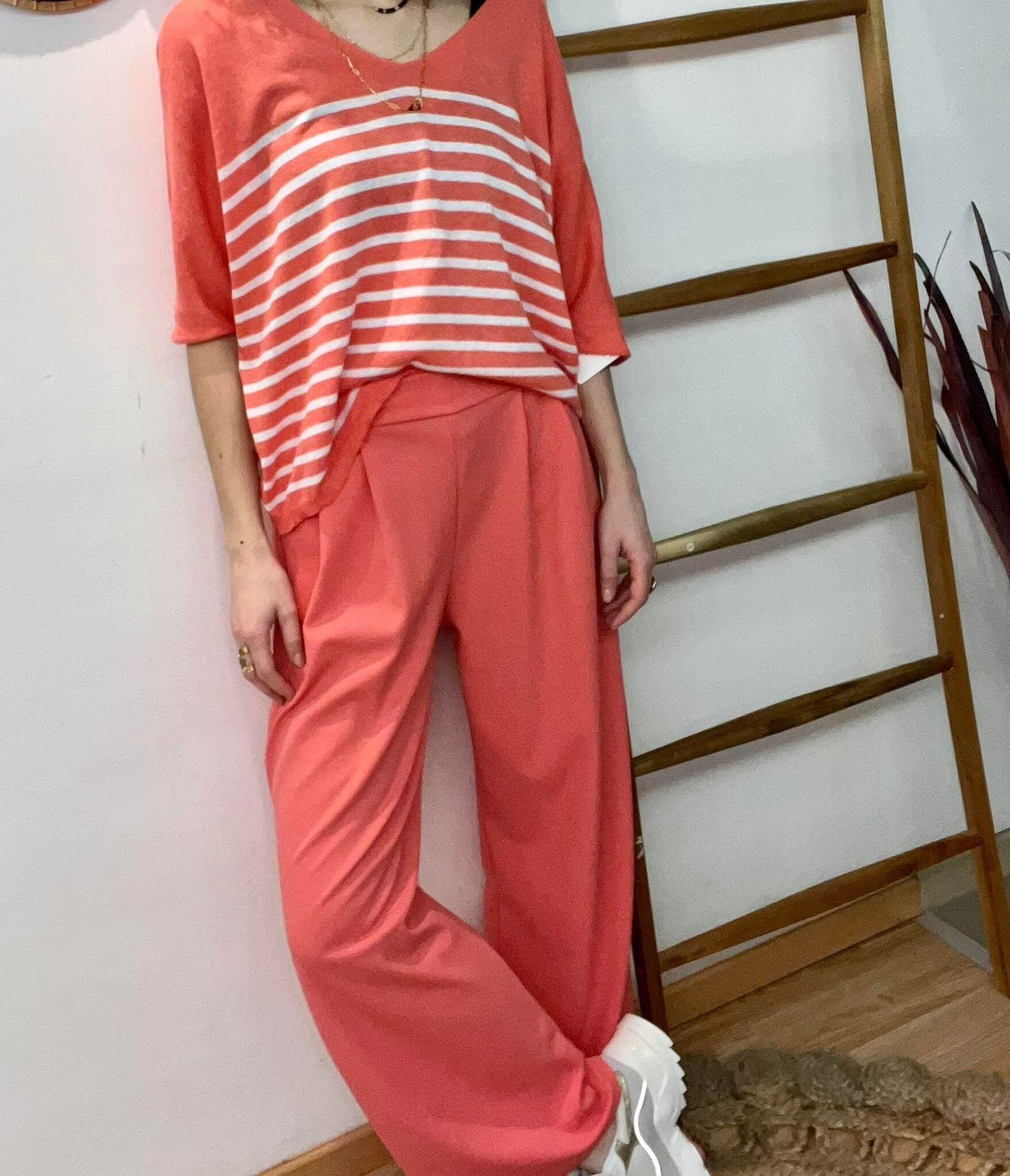 Pantalon large ultra confort, jambes larges, élastique taille (arrière), poches coté, 2 pinces avant.