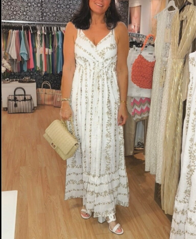 Robe cache cœur aspect lin brodé aux fils d'or, doublée ,smockée à la taille avec cordon pour resserrer la taille. Bretelles réglables.