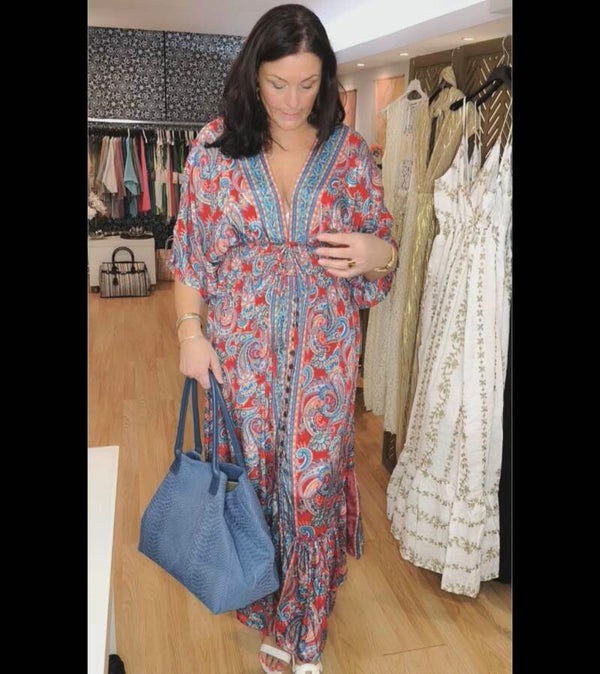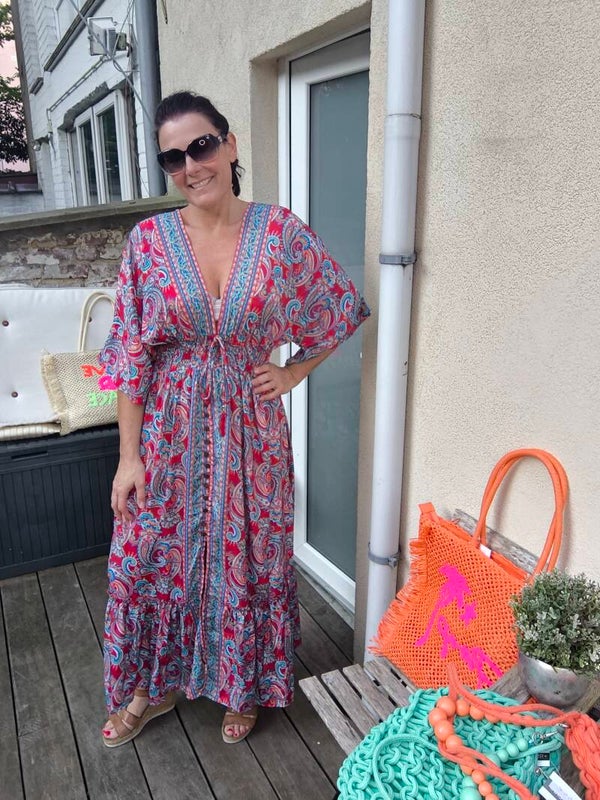 Robe imprimé cachemire , élastique à la taille, faux noeud à la taille, fendue devant avec boutons. Décolleté avez plongeant avant et arrière, lien à nouer dans le cou.
