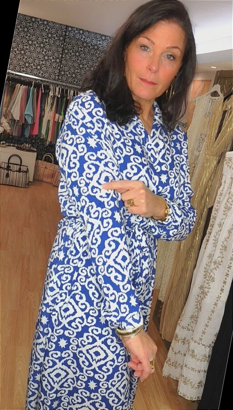 Robe chemise imprimée entièrement boutonnée. Patte avec bouton pour relever la manche. Cordon dans le même tissu pour nouer à la taille.