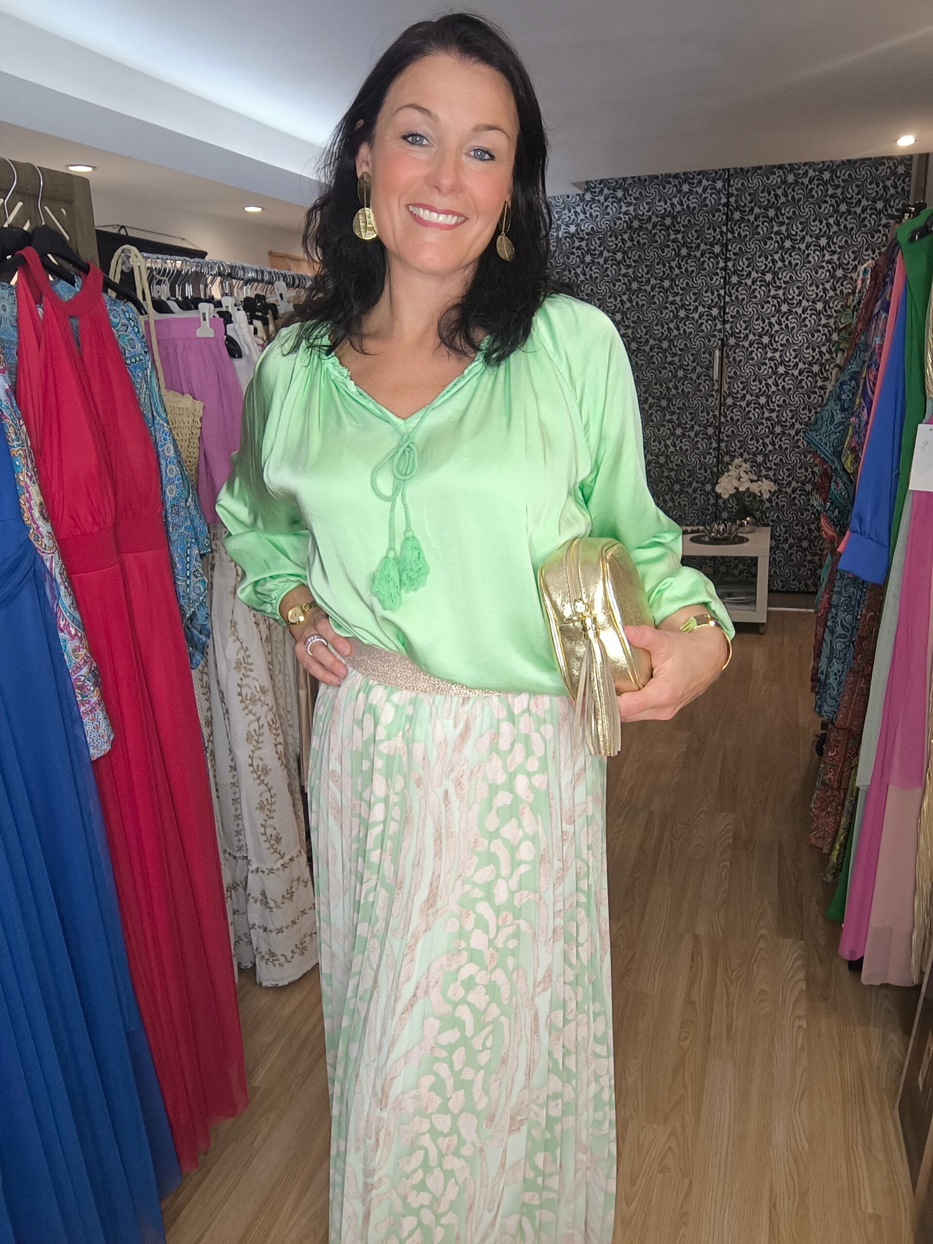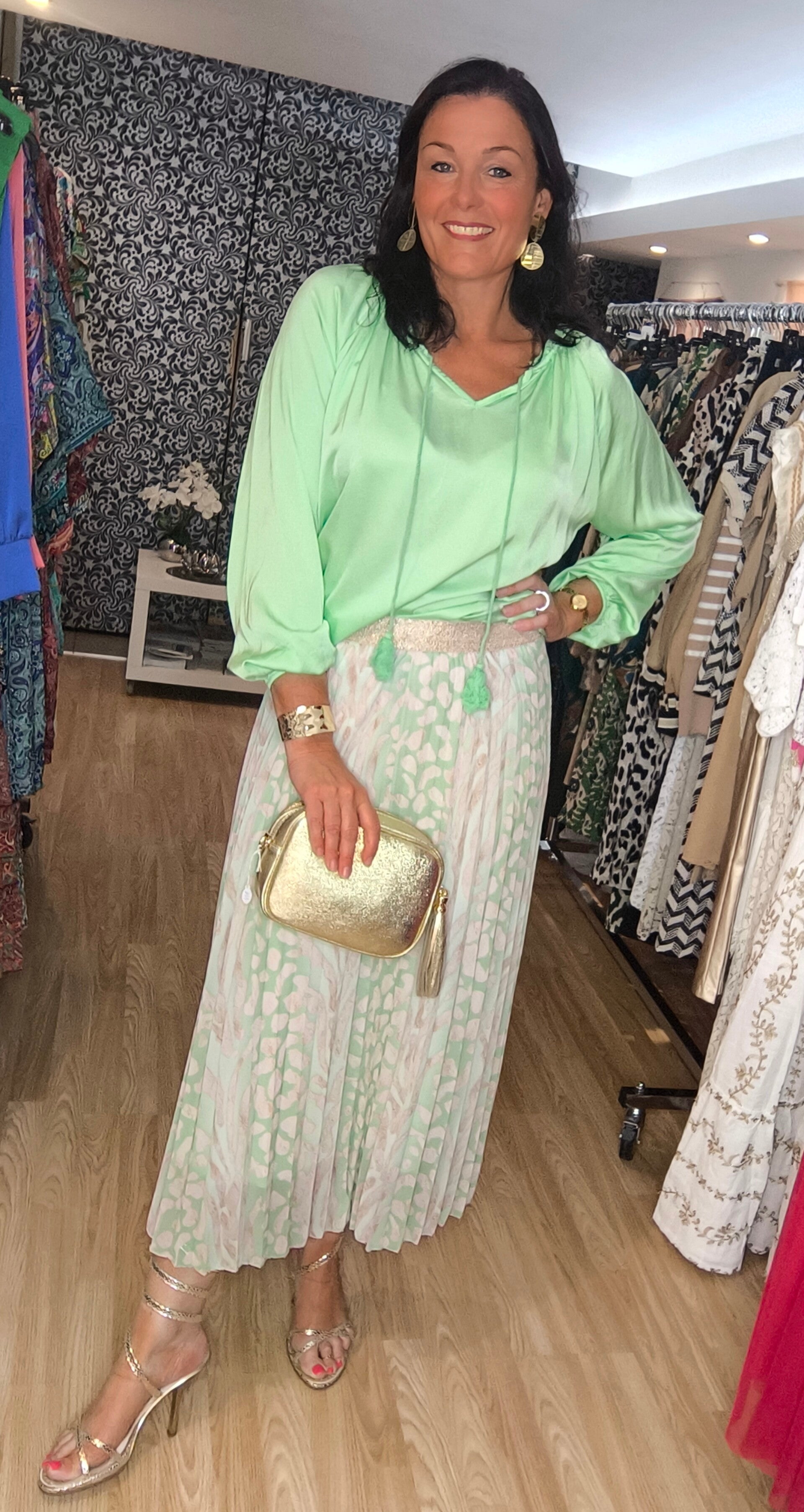 Jupe plissée avec doublure et élastique en lurex doré à la taille.