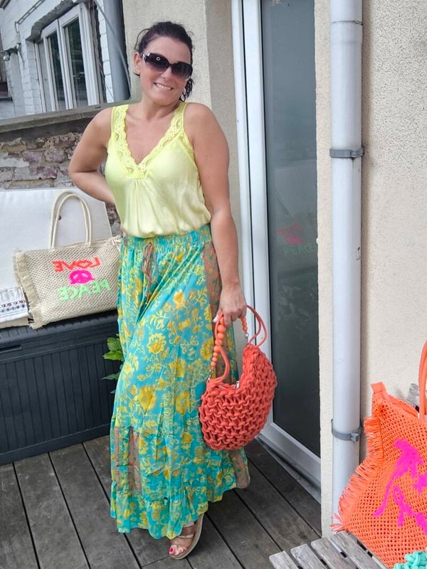 Jupe extra longue, imprimé cachemire, taille smockée, cordon décoratif.