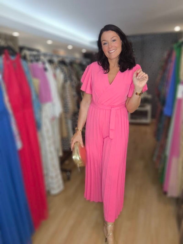 Combi pantalon cache-coeur, plissé plat aux jambes, manches courtes volantées, ceinture à nouer à la taille.