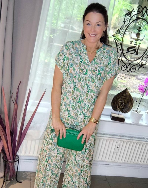 Ensemble 2 pièces avec pantalon fluide, élastique à la taille et blouse col V et petite pince décolleté.
