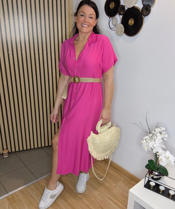 Robe chemise longueur midi boutonnée avec passants à la taille et ceinture en rafia incluse. Manches courtes légèrement chauve-souris.
