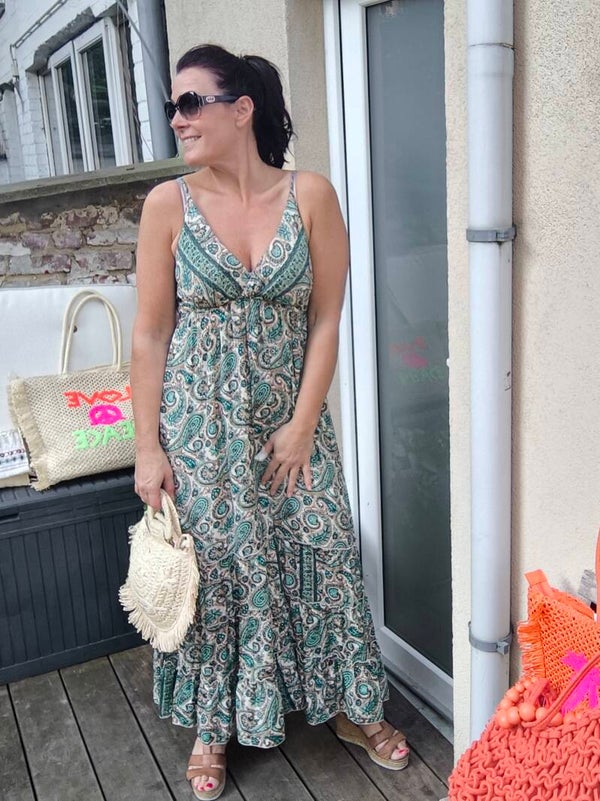 Robe longue cache cœur à bretelles, dos élastique.