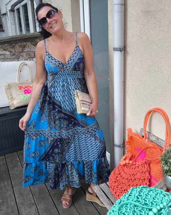 Robe longue imprimée cachemire avec bretelles réglables et élastique smoké à la taille, smokée plus large dans le dos.