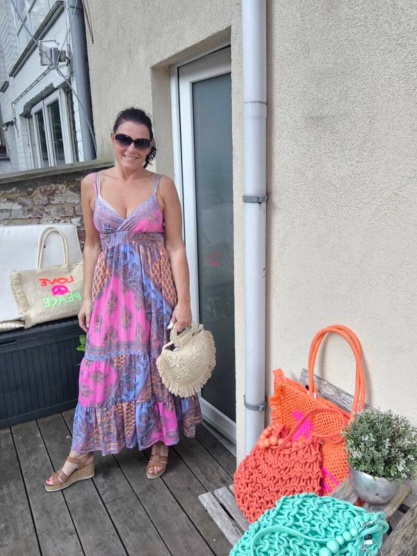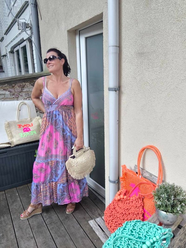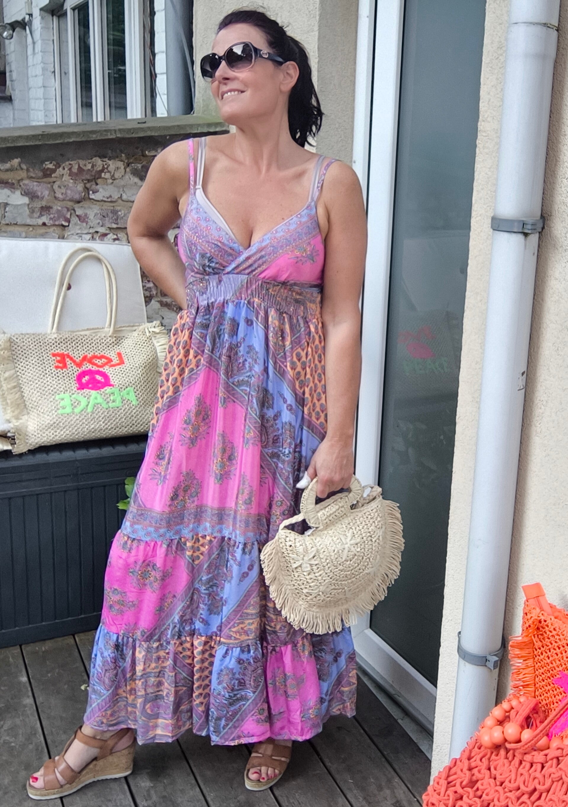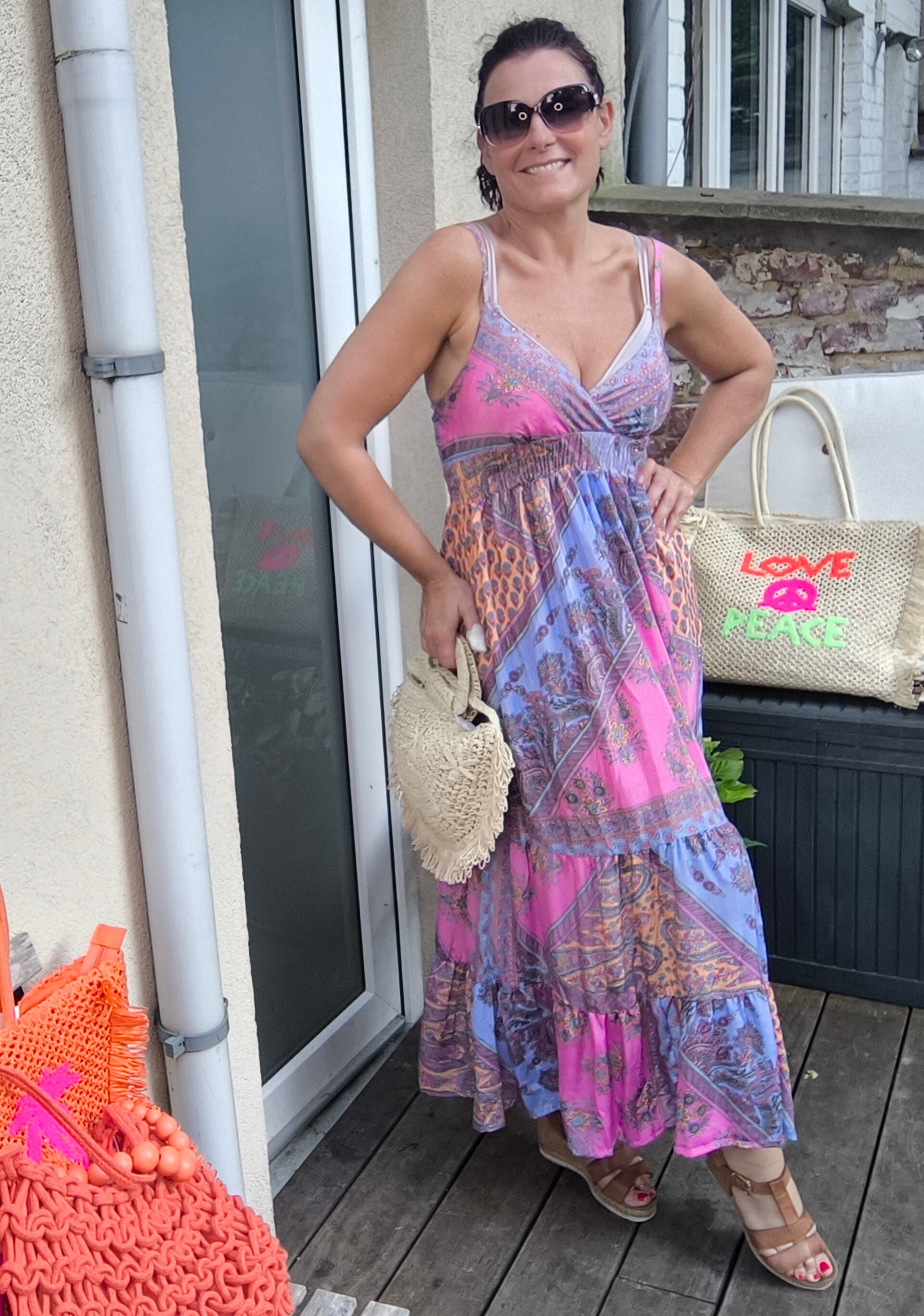 Robe longue imprimée cachemire avec bretelles réglables et élastique smoké à la taille, smokée plus large dans le dos.