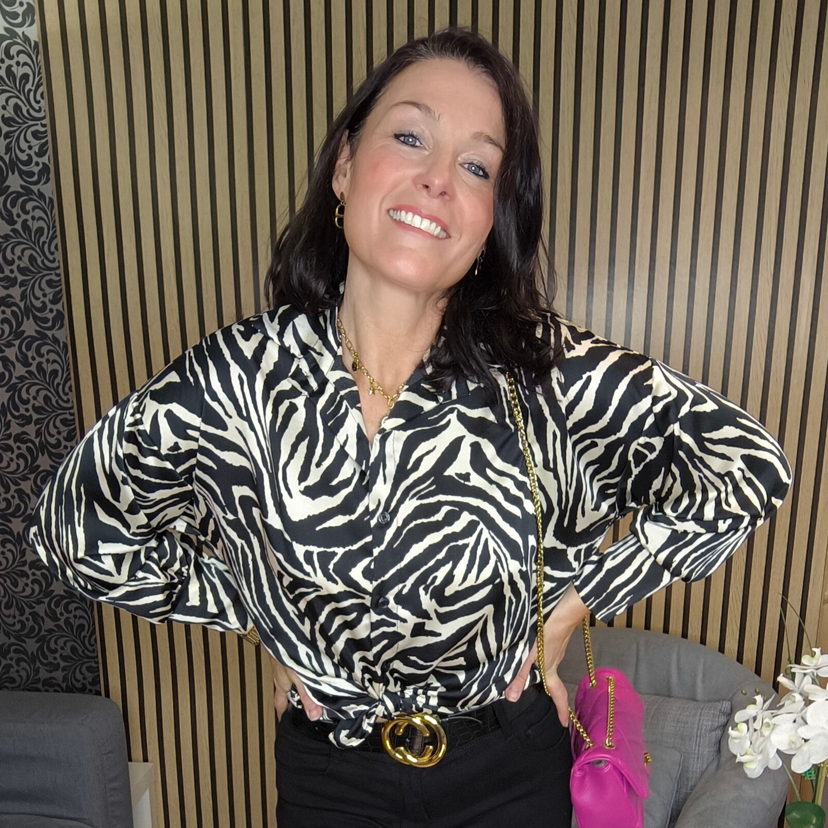 Chemise fluide satinée , boutonnée, imprimé zèbre. Doubles boutons aux manches.