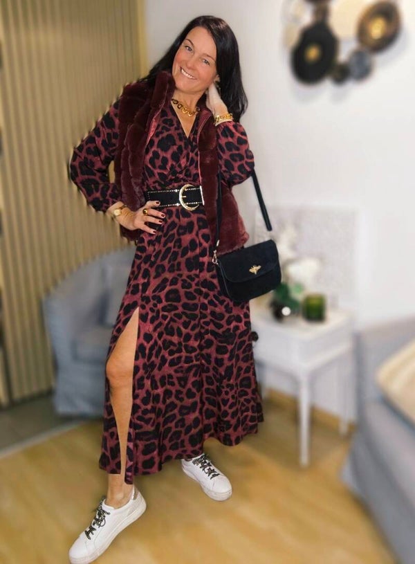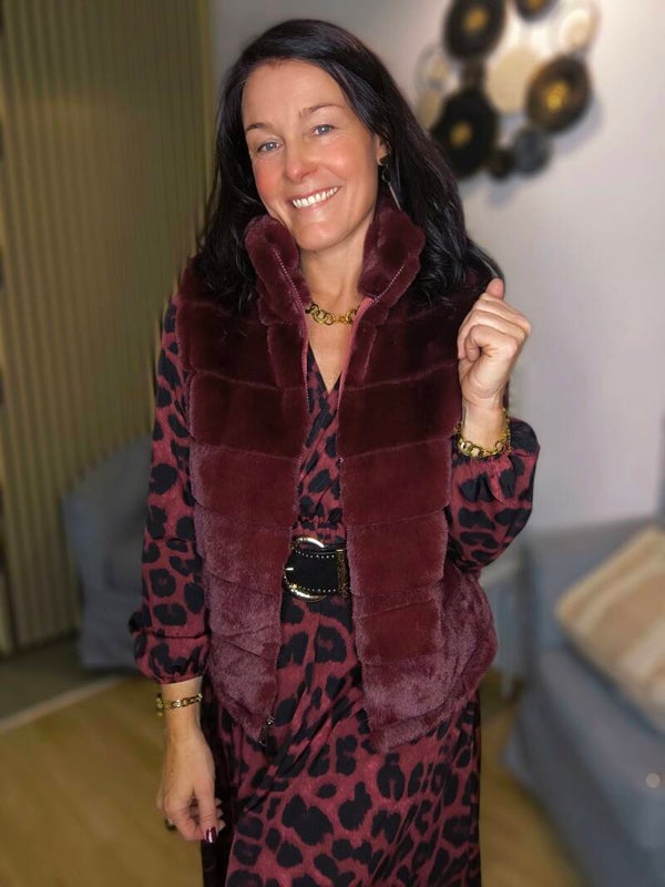 doudoune sans manches en fausse fourrure avec col montant et fermeture éclair.