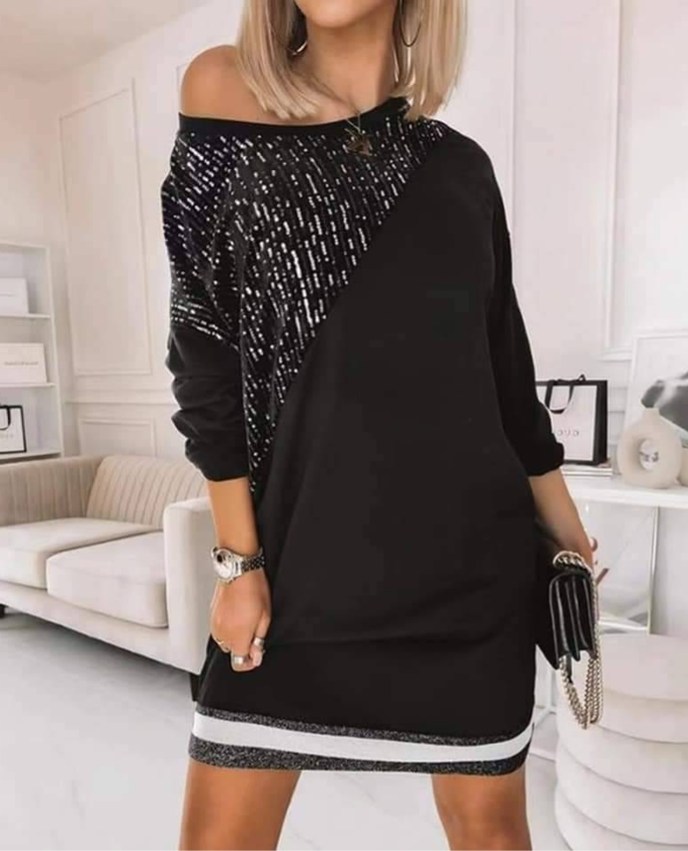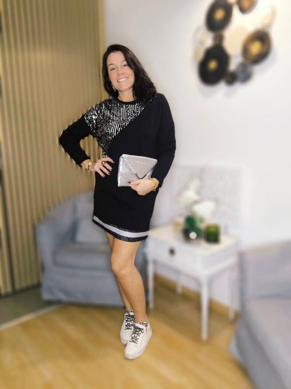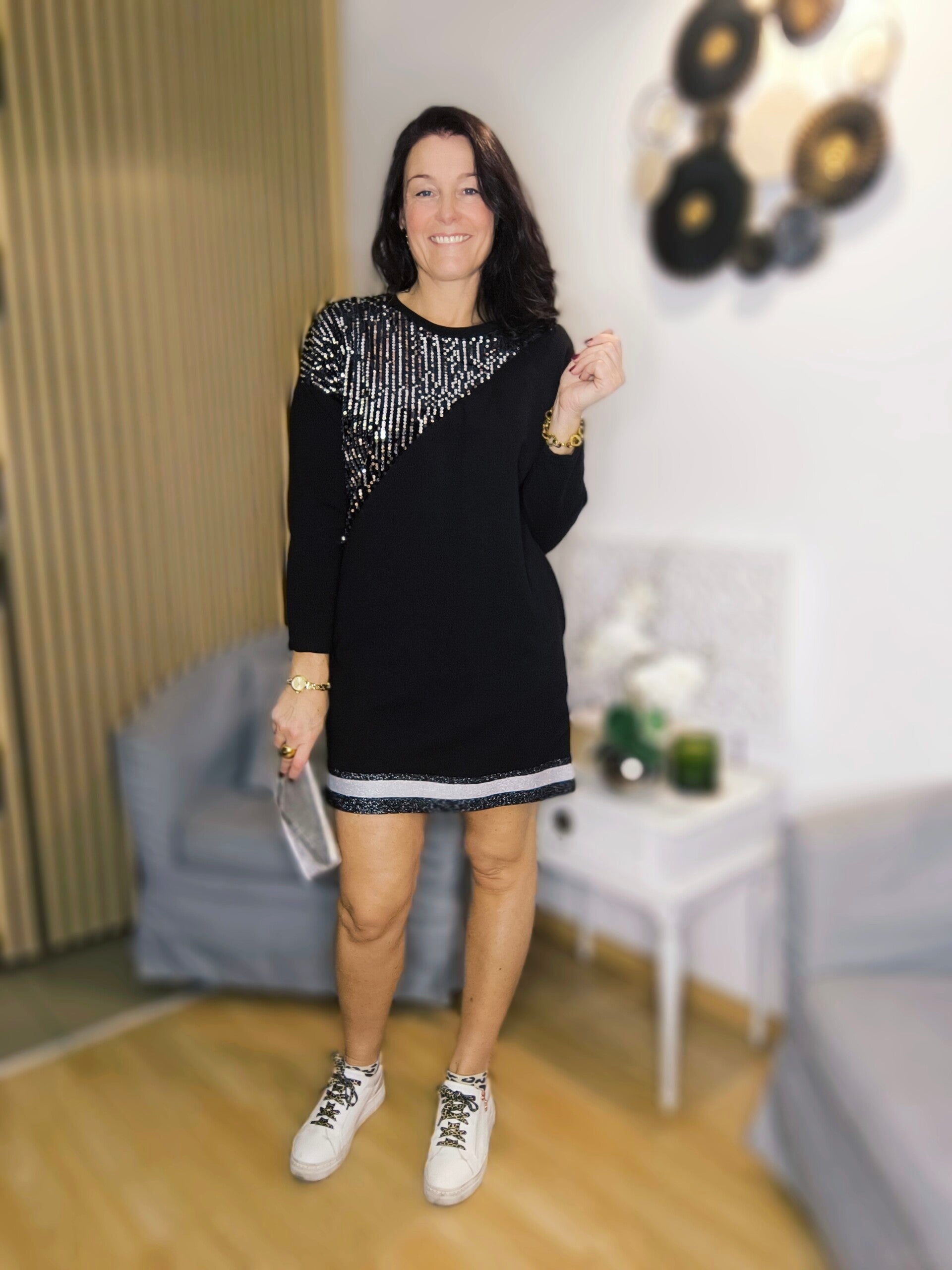 Robe en matière sweat, ornée de sequins et lurex argentés.
