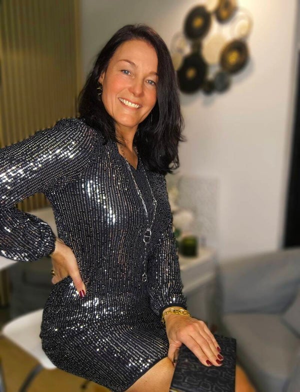 Robe col V entièrement en sequins argentés, doublée, manches longues. Élastique aux poignets.