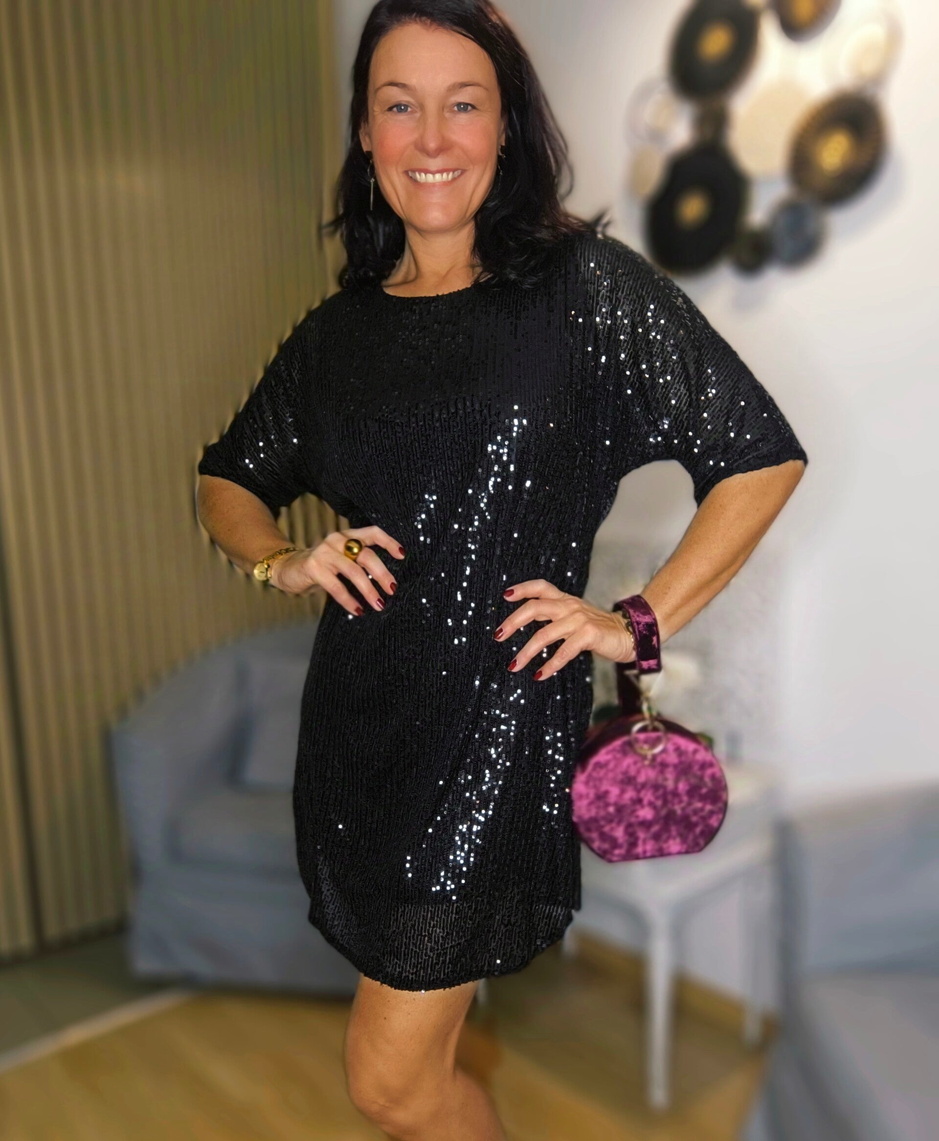 robe col rond manches courtes légèrement chauve-souris entièrement en sequins, courte et doublée