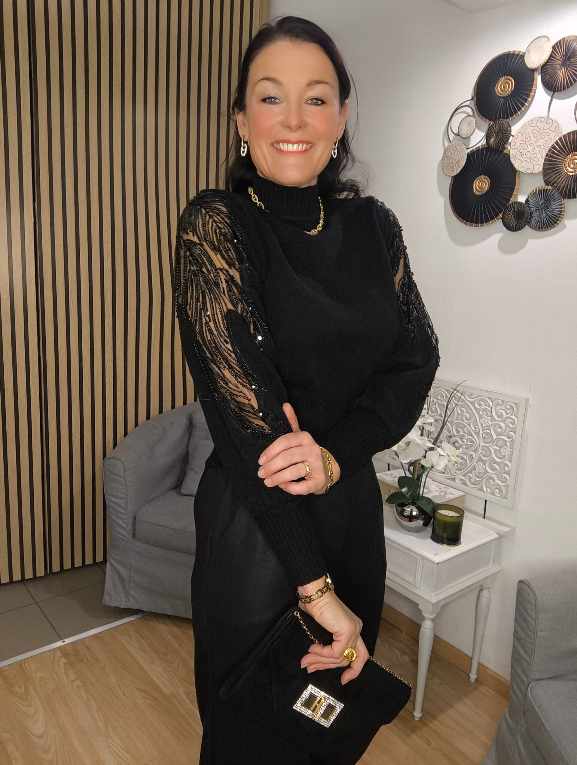 Très beau pull col cheminée avec les manches en transparence brodées de sequins et de perles .