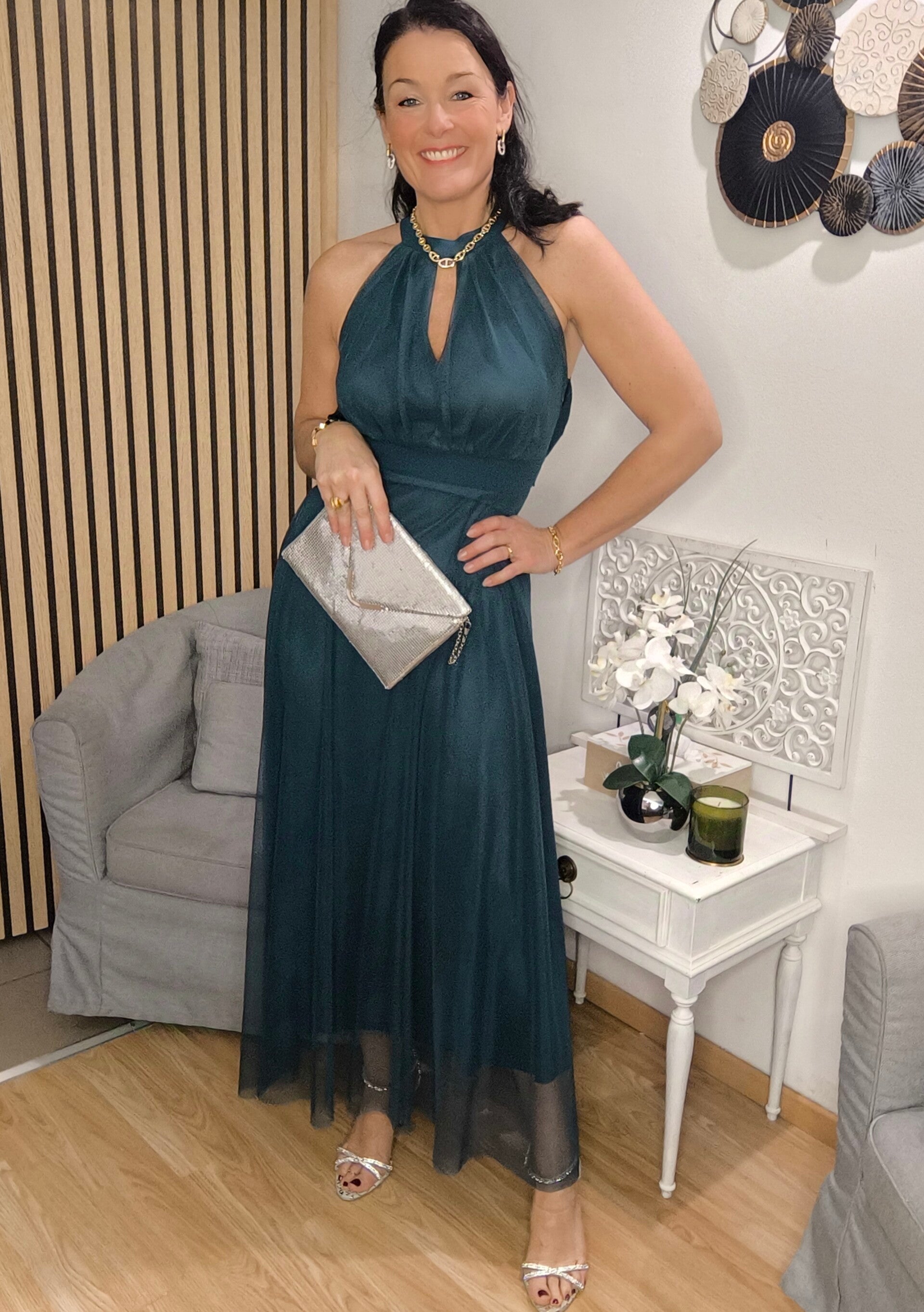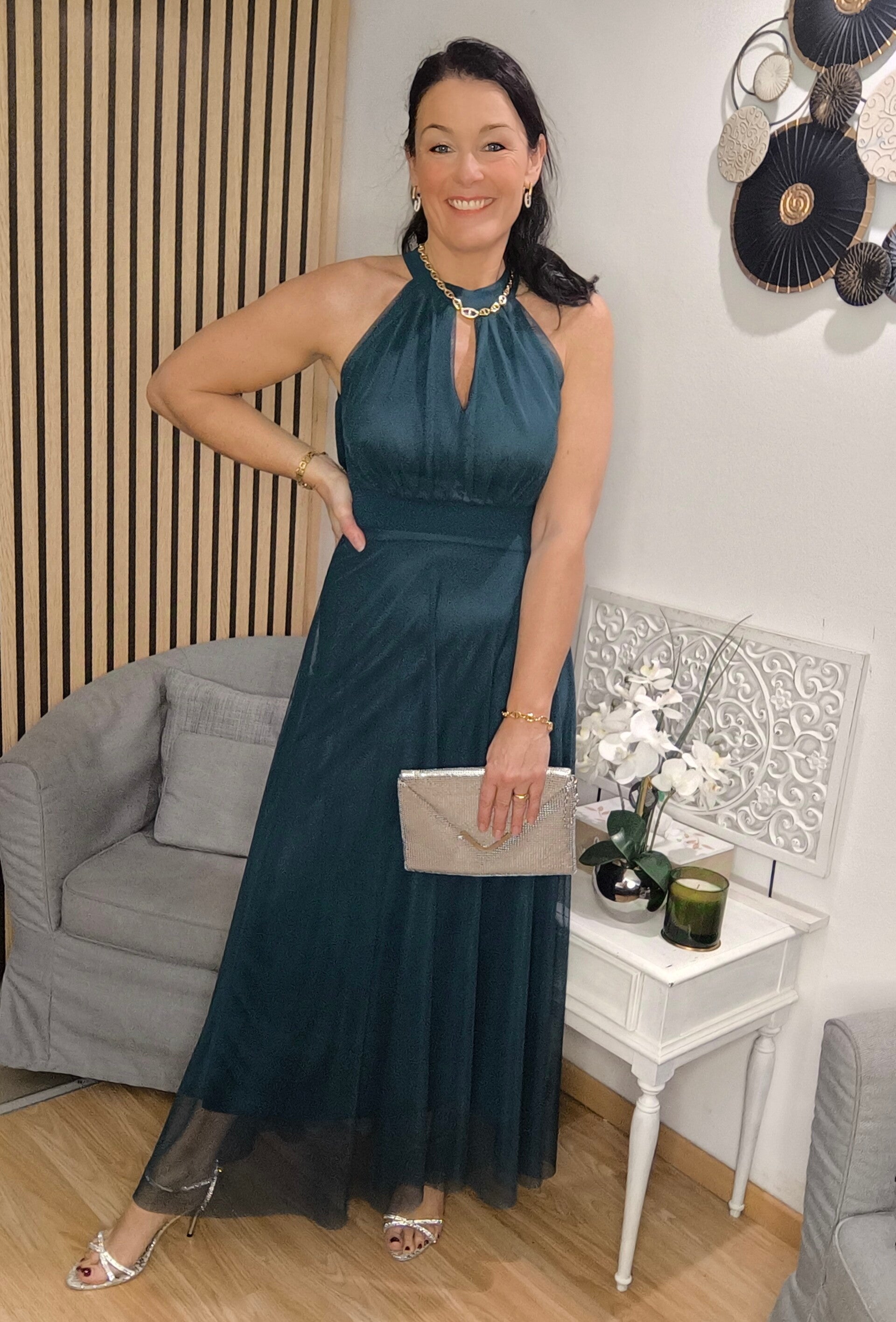 Robe de soirée en voile organza doublée viscose, coques pour la poitrine et ceinture en voile organza à nouer à l'arrière de la taille.