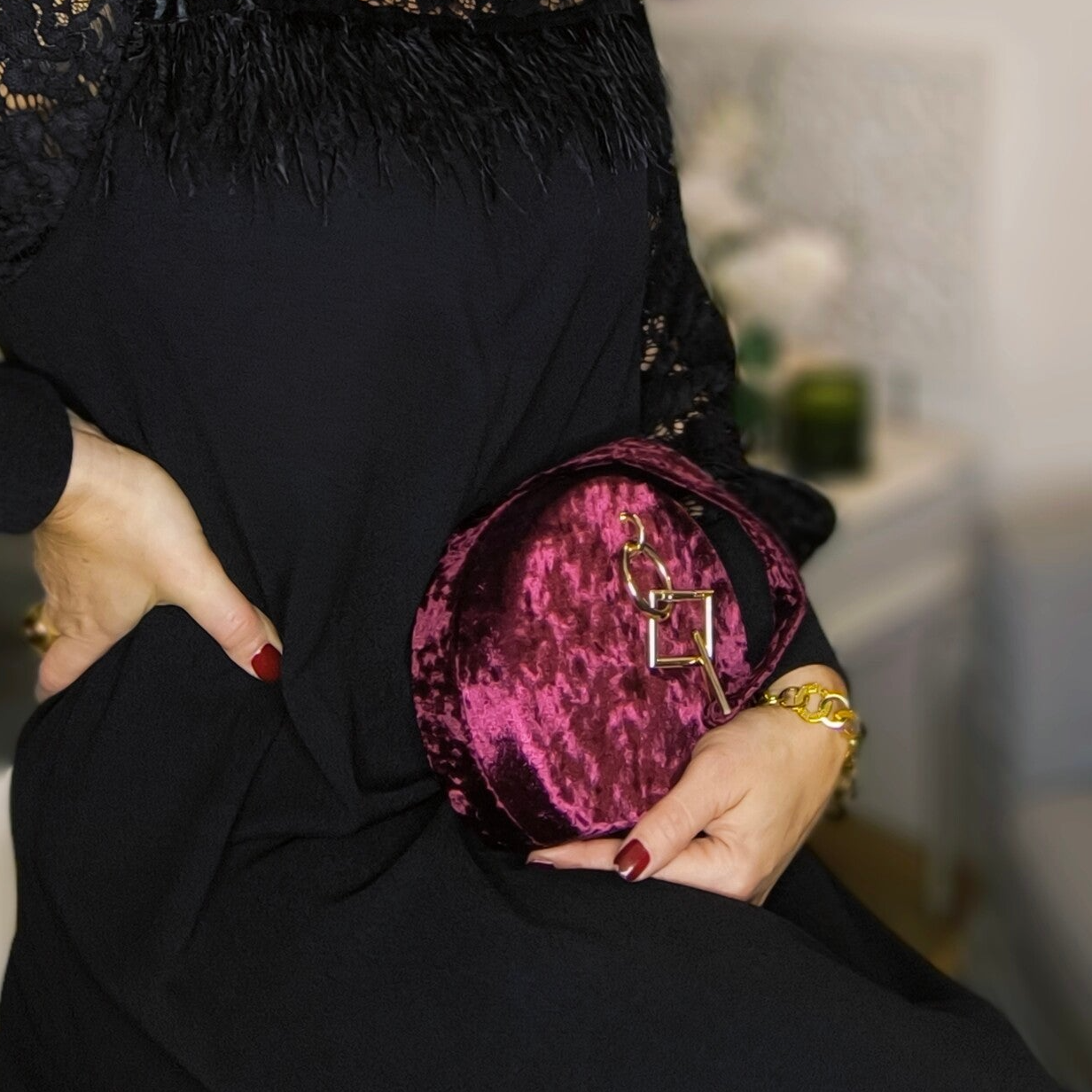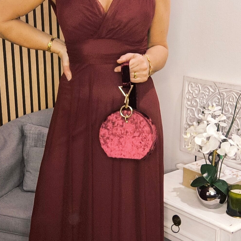 Petit sac rond en velours bordeau et anse bijou doré.