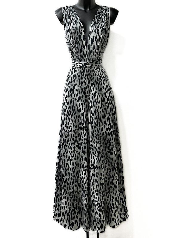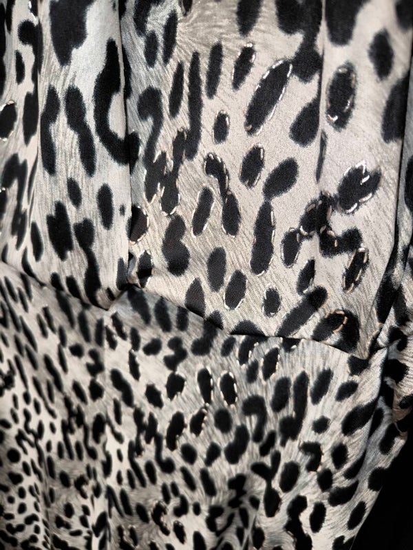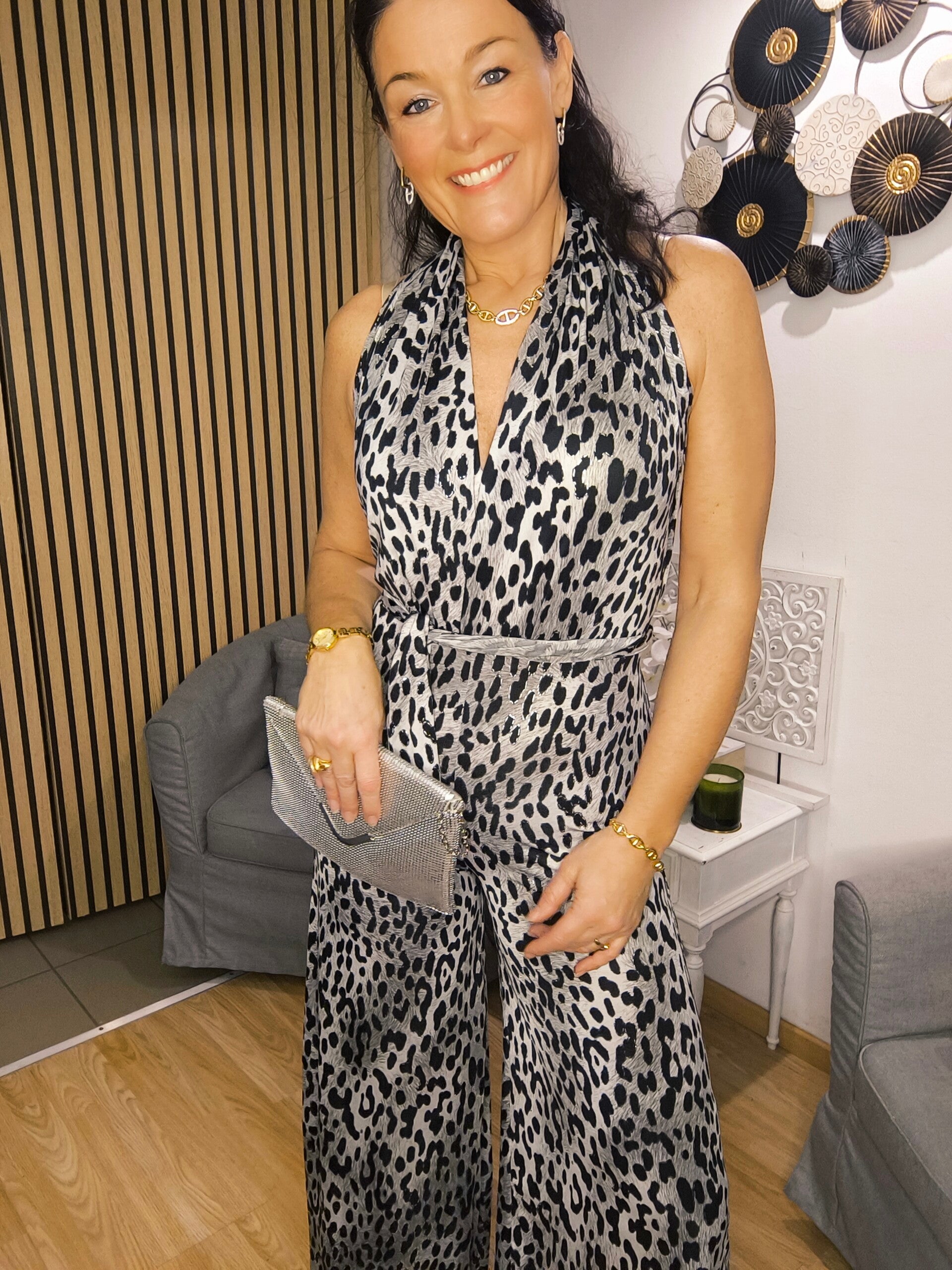 Combinaison pantalon multi-positions dos nu, matière stretch imprimé léopard noir et gris et tacheté argent