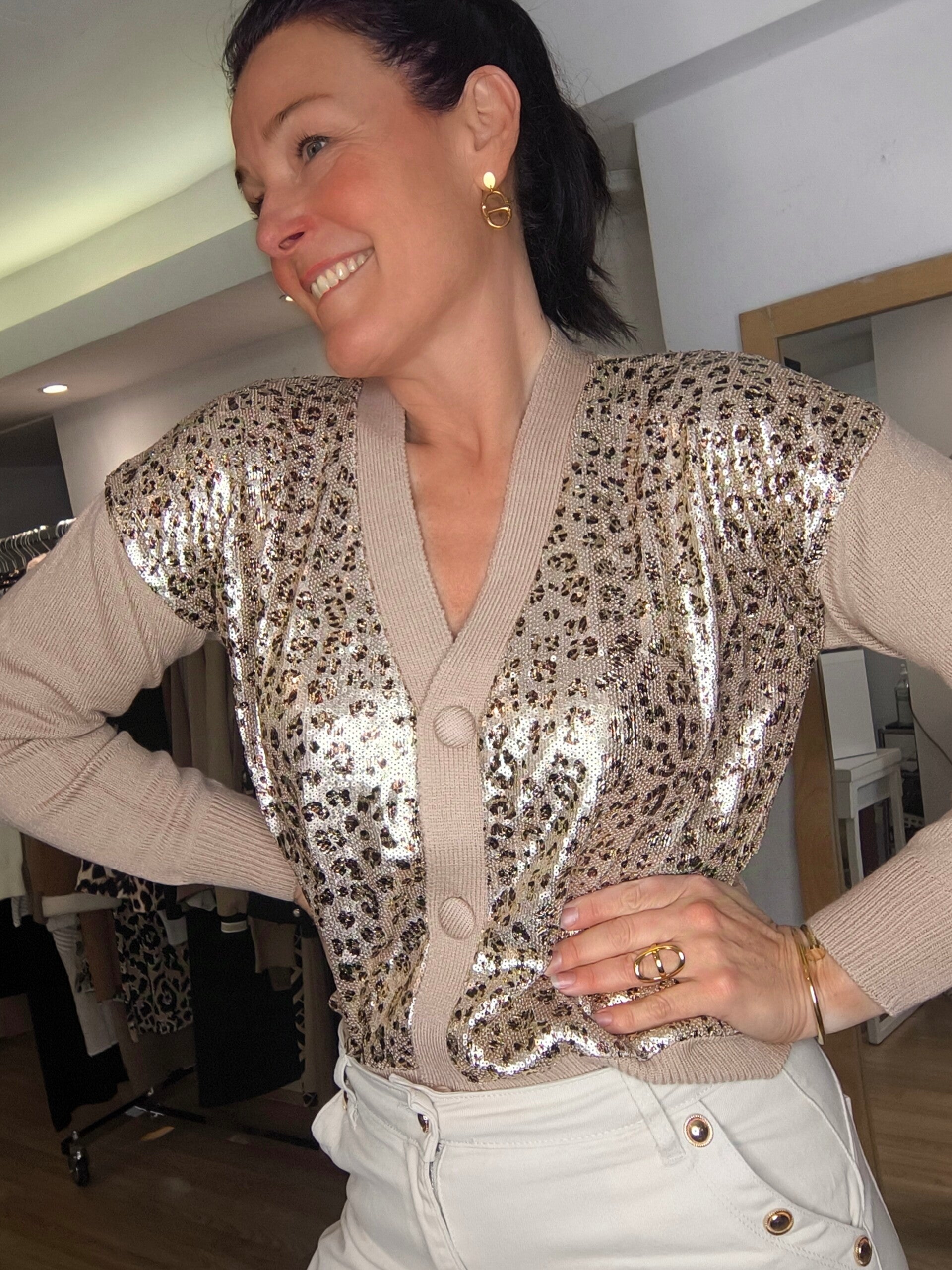 Gilet en maille camel avec tout l'avant du gilet en sequins léopard, trois gros boutons en maille.