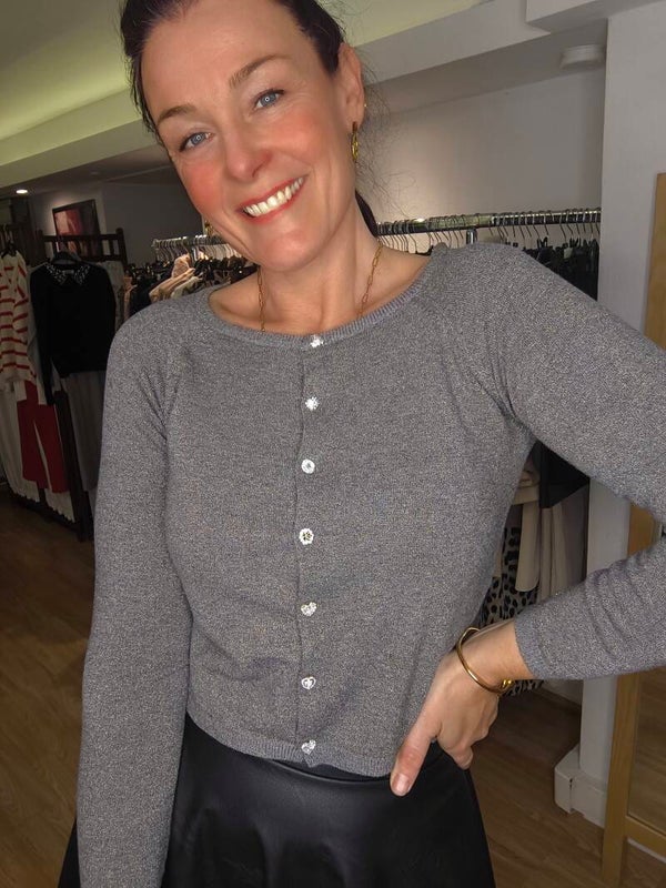 petit gilet court et pailleté , refermé par des petits bouton de formes différentes avec strass. Près du corps, maille légèrement extensible.