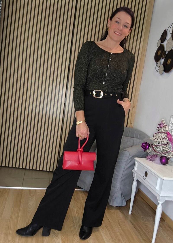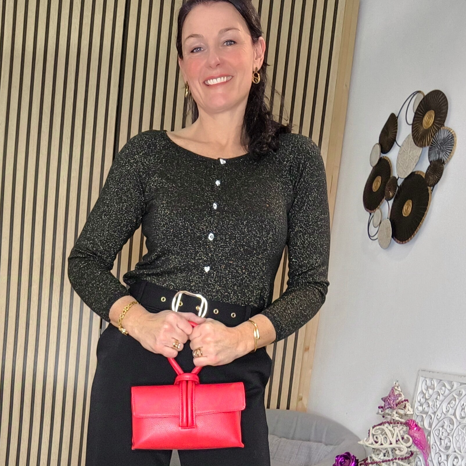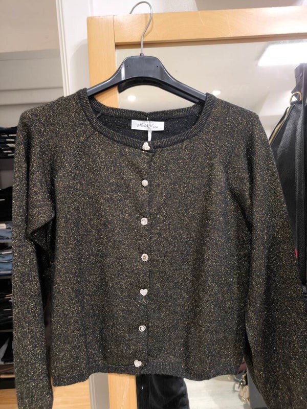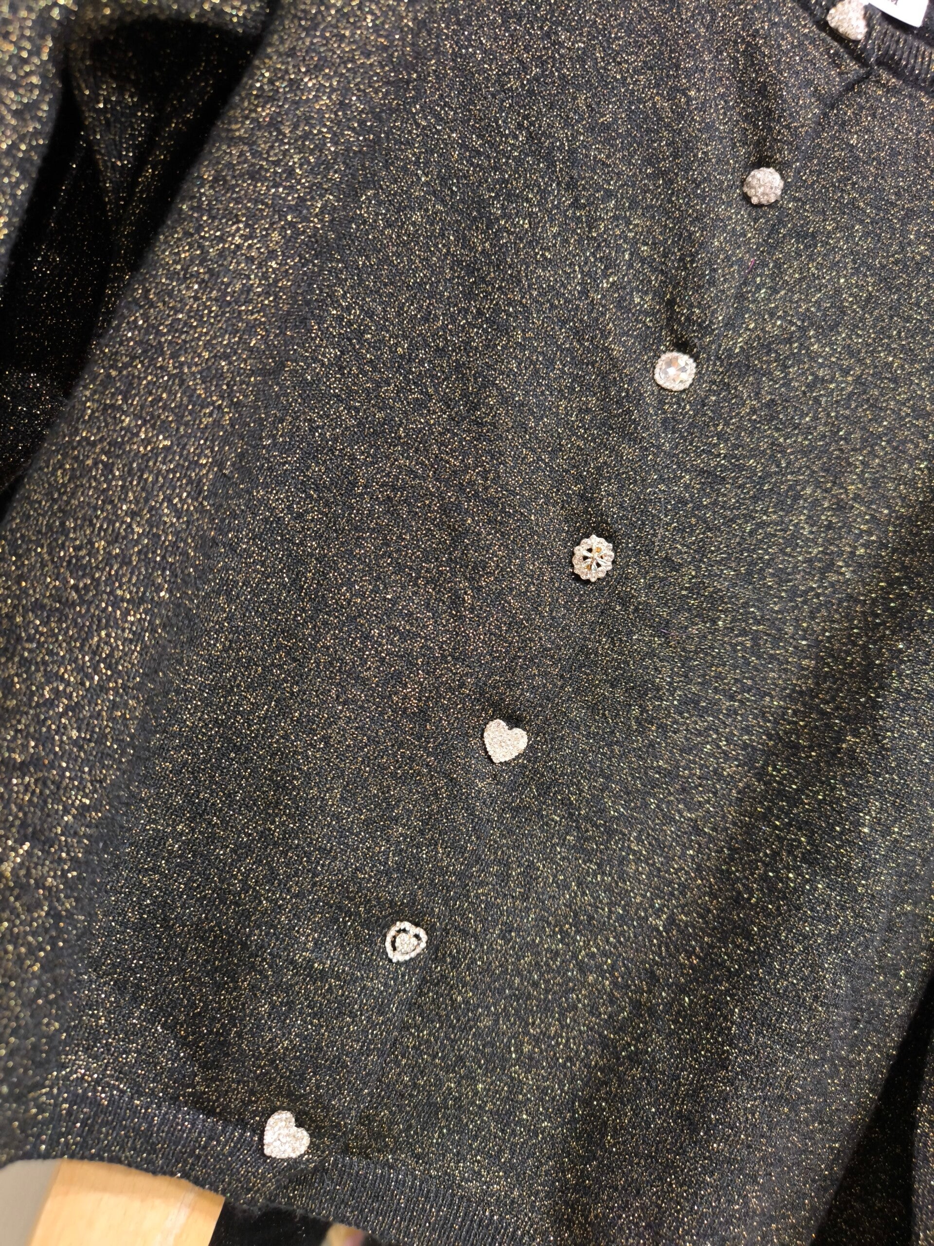 petit gilet court et pailleté , refermé par des petits bouton de formes différentes avec strass. Près du corps, maille légèrement extensible.