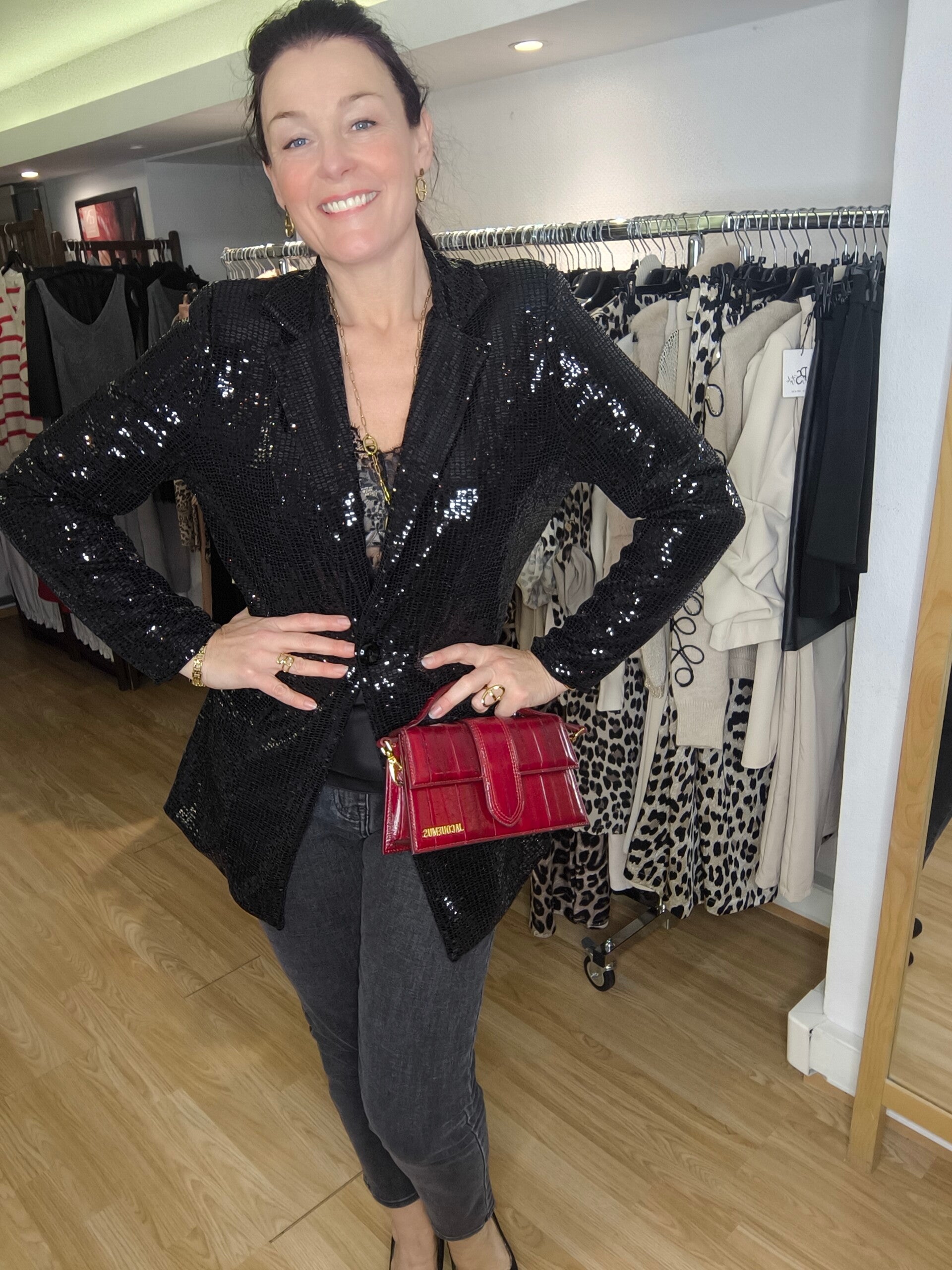 Blazer noir entièrement recouvert de paillettes. De fausse poche et refermé par un bouton à la taille.