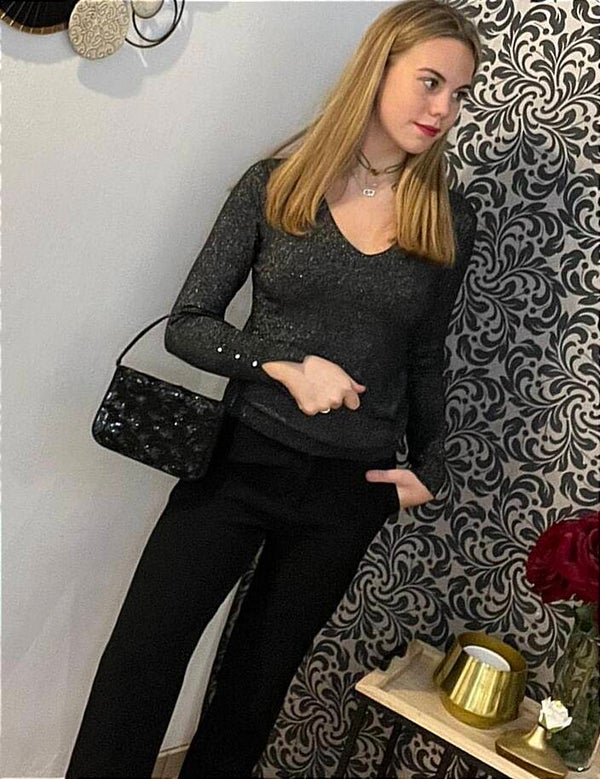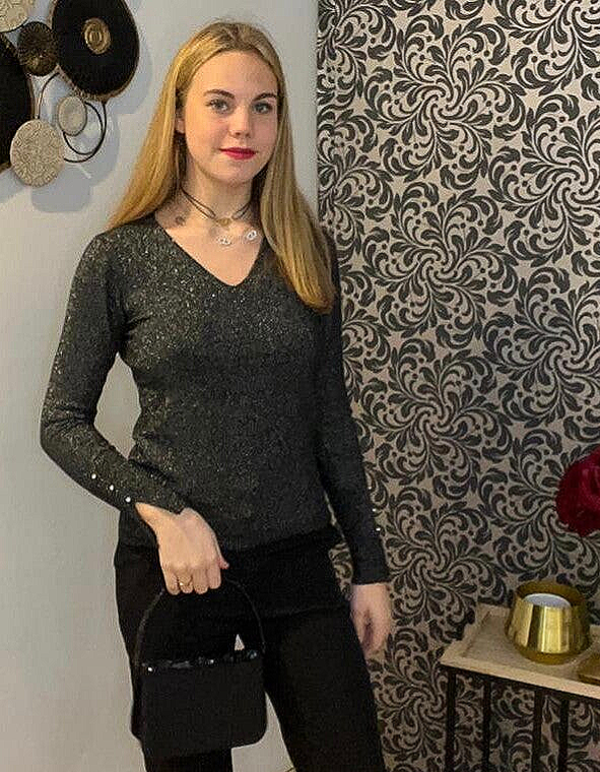 Pull noir en V irisé en lurex argenté, fendu aux poignets et décor boutons strass zirconiums sur les avant-bras .