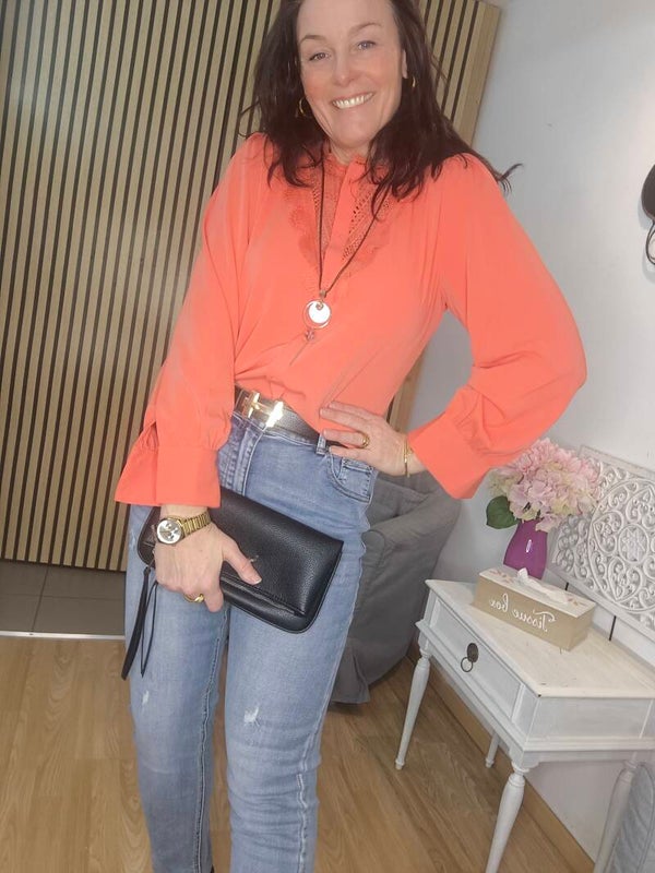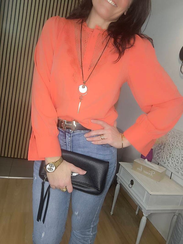 chemisier col mao avec encolure en dentelle. Matière légèrement satinée.