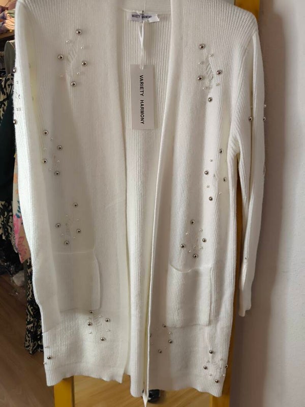 long gilet avec effet déchiré par endroit ainsi que zones avec clous et perles.