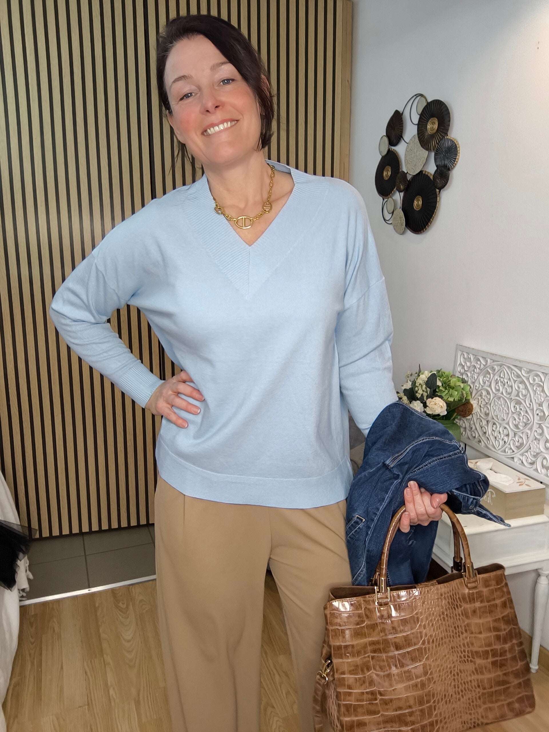 Pull col V taille unique légèrement oversize avec fente sur le côté et plus long derrière.