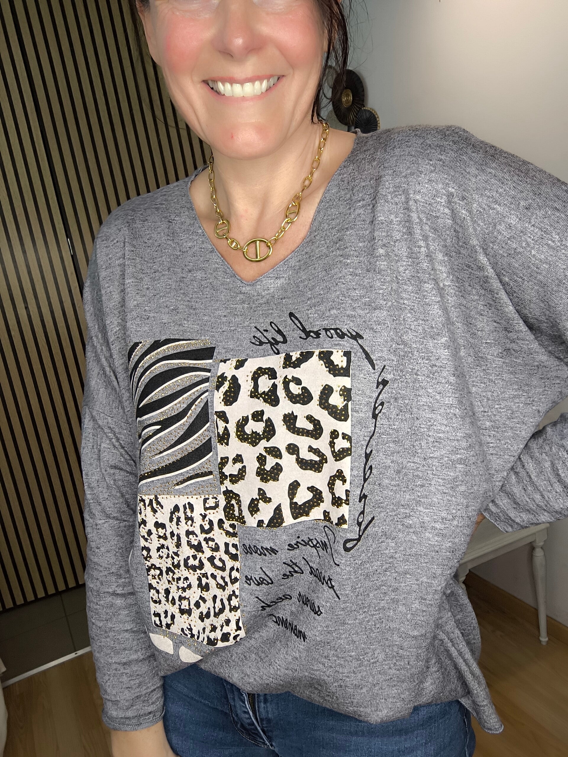 pull col V large avec imprimé léopard et zèbre