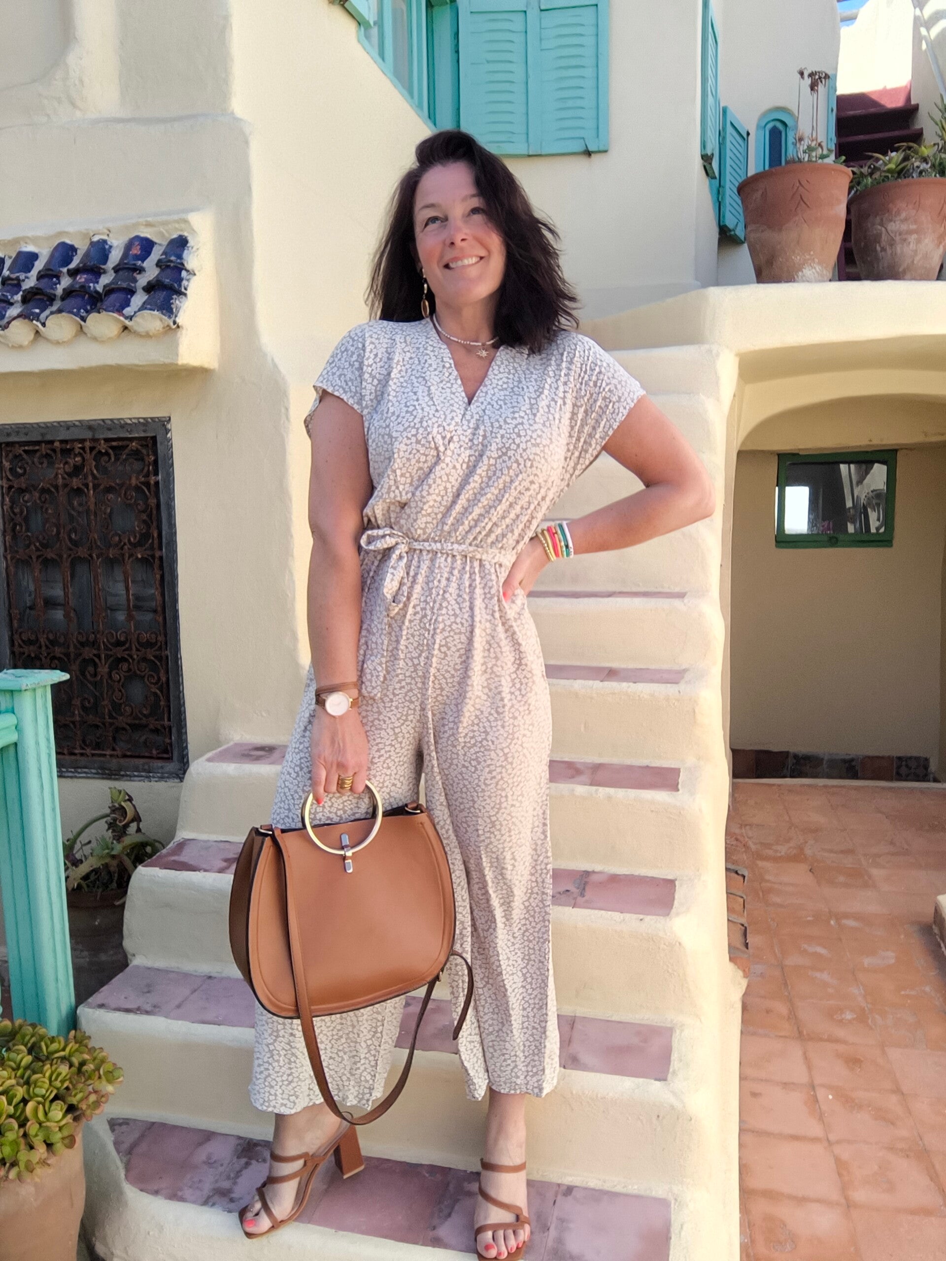Combi pantalon fluide et ultra légère,large , cache-cœur chauve-souris manches courtes. Élastique à la taille avec ceinture à nouer. Encolure du dos en goutte avec petit bouton.