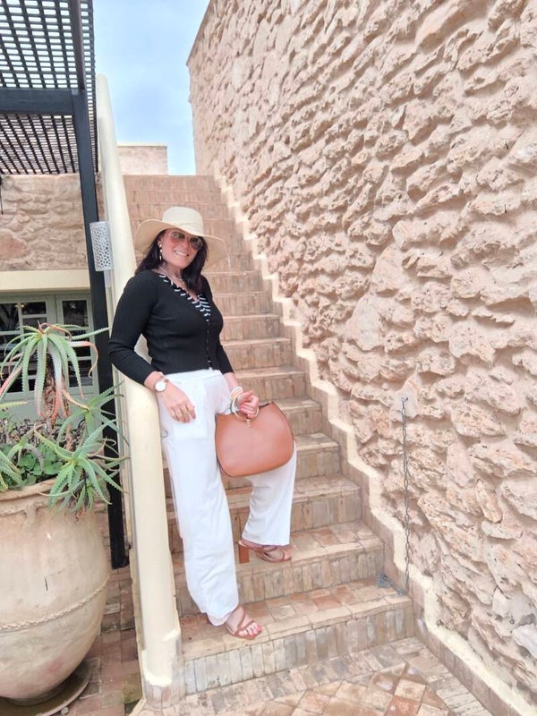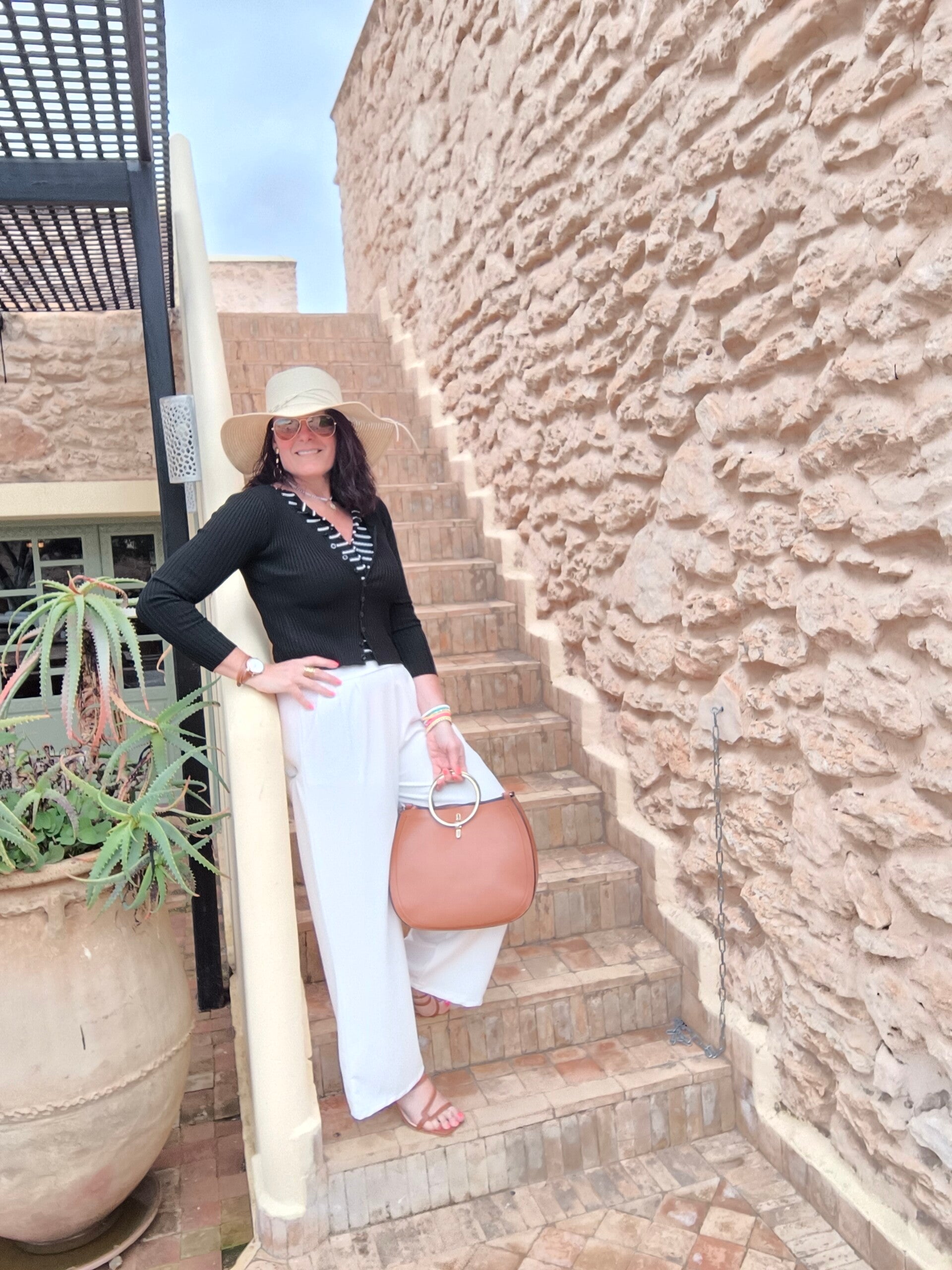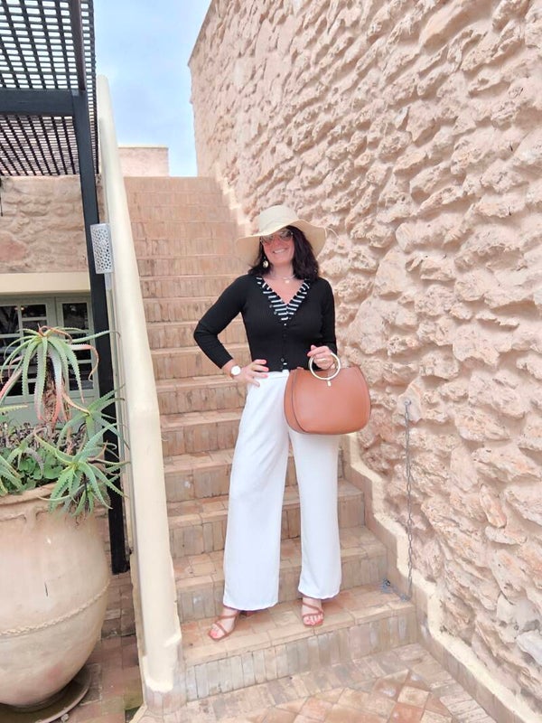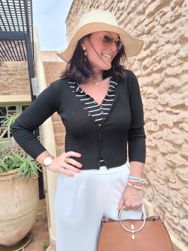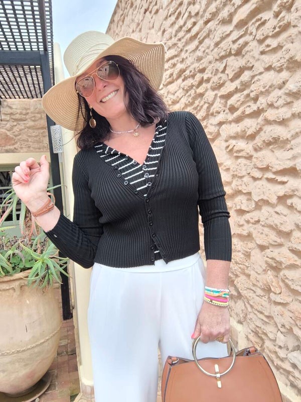 Twin-set côtelé composé d'un top boutonné rayé blanc et noir et d'un gilet noir accroché au top.