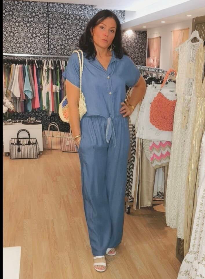 Blouse en jeans fluide boutonnée et nouée à la taille.