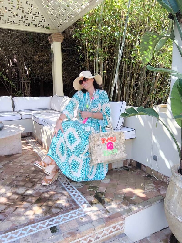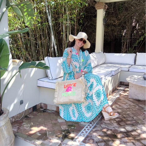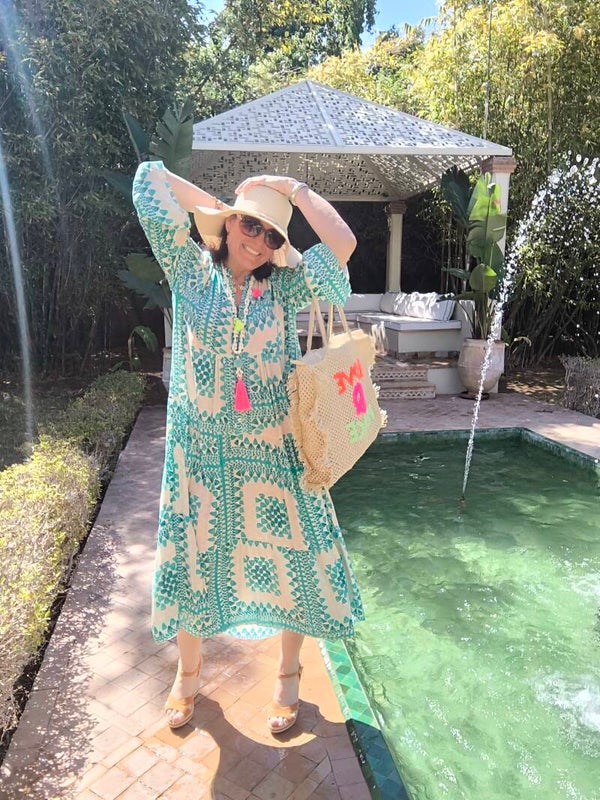 Robe large boutonnée dans le décolleté jusqu'au premier volant, manches amples 3/4.