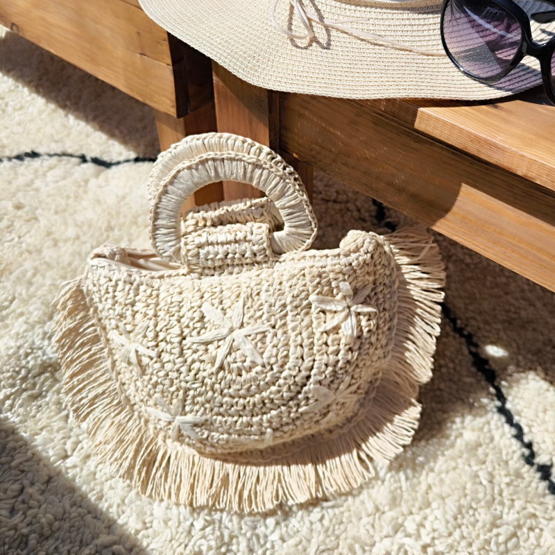 Sac en rafia, lanière + 2 anses, tirette et poches intérieures.