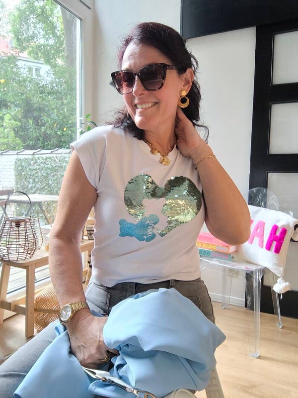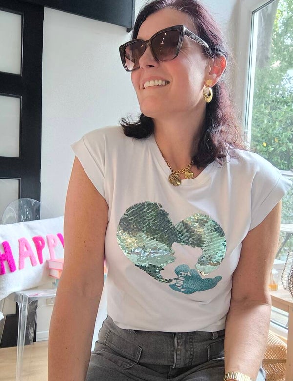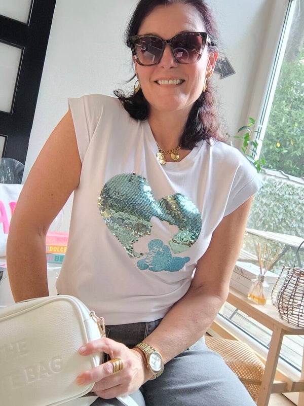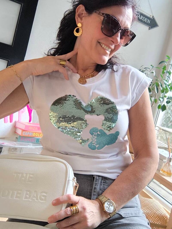 t-shirt manches courtes repliées imprimé cœur en sequins bleus et ourson en paillettes.
