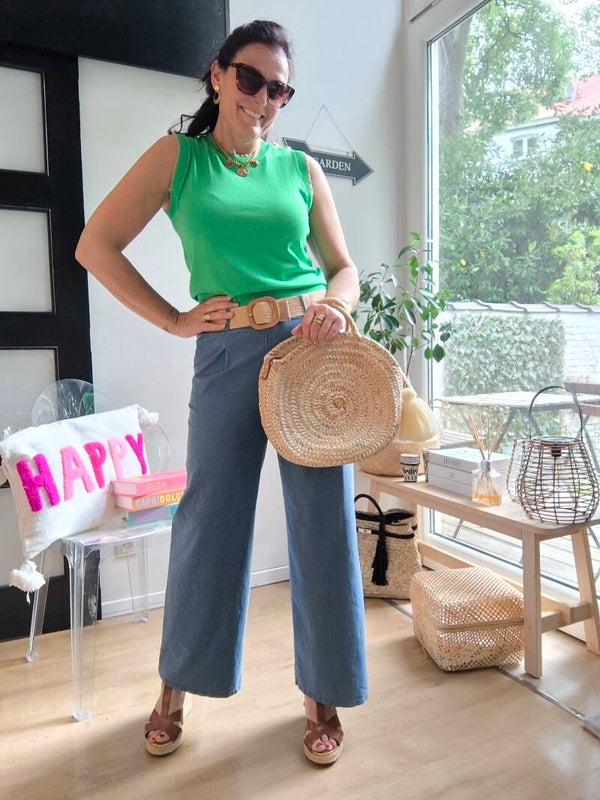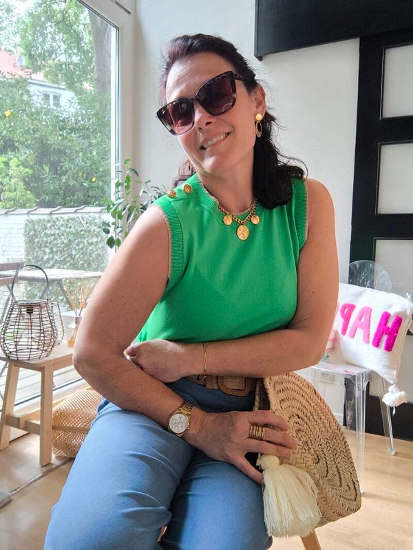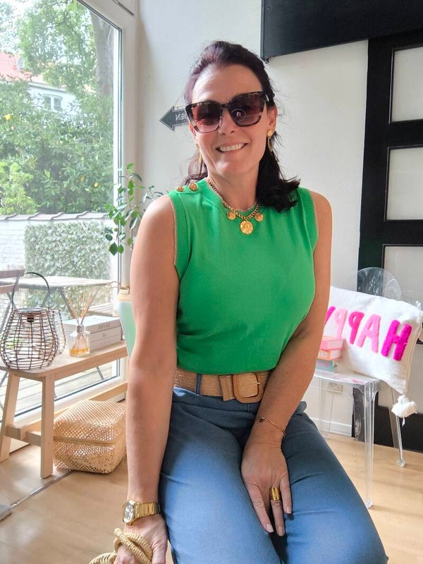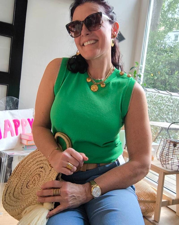 Top sans manches, lurex sur le bord des manches et du col, 2 boutons marins dorés sur une épaule.